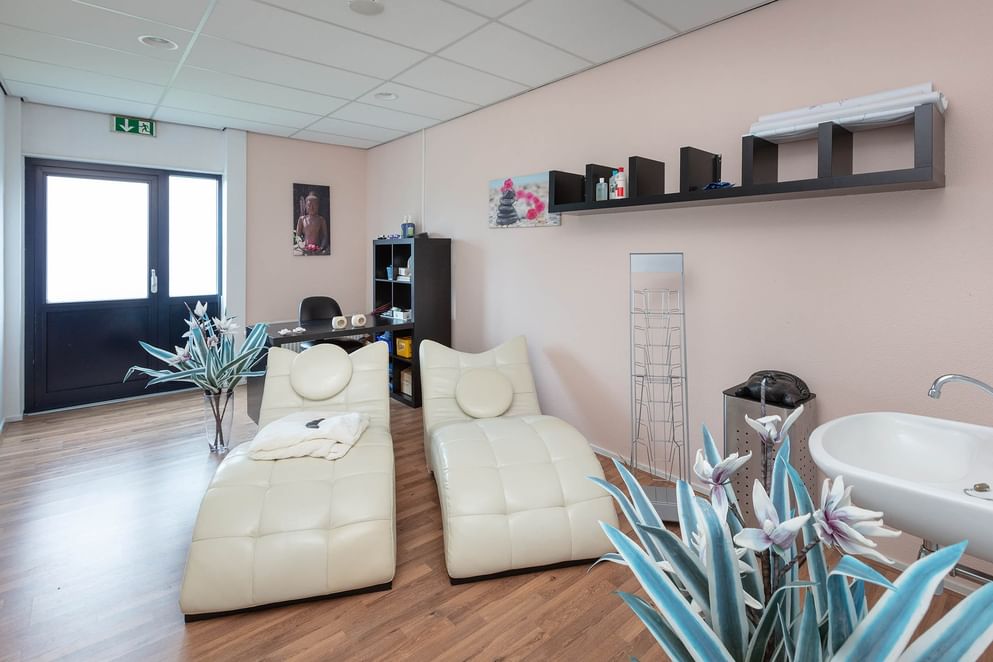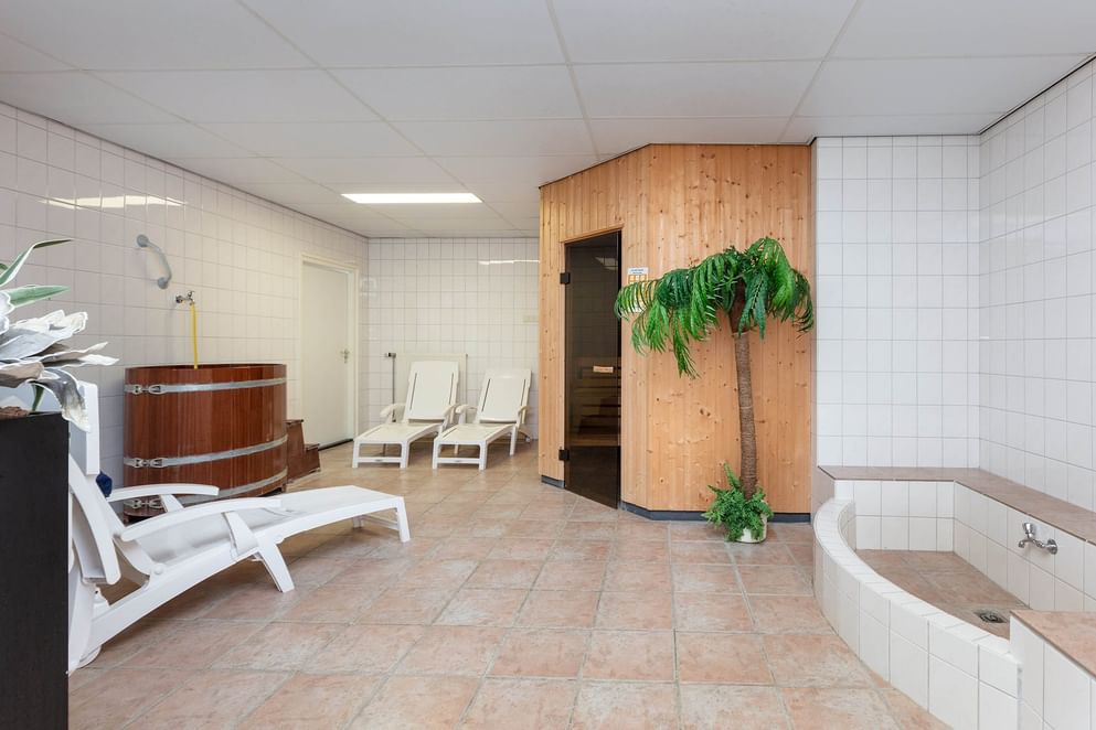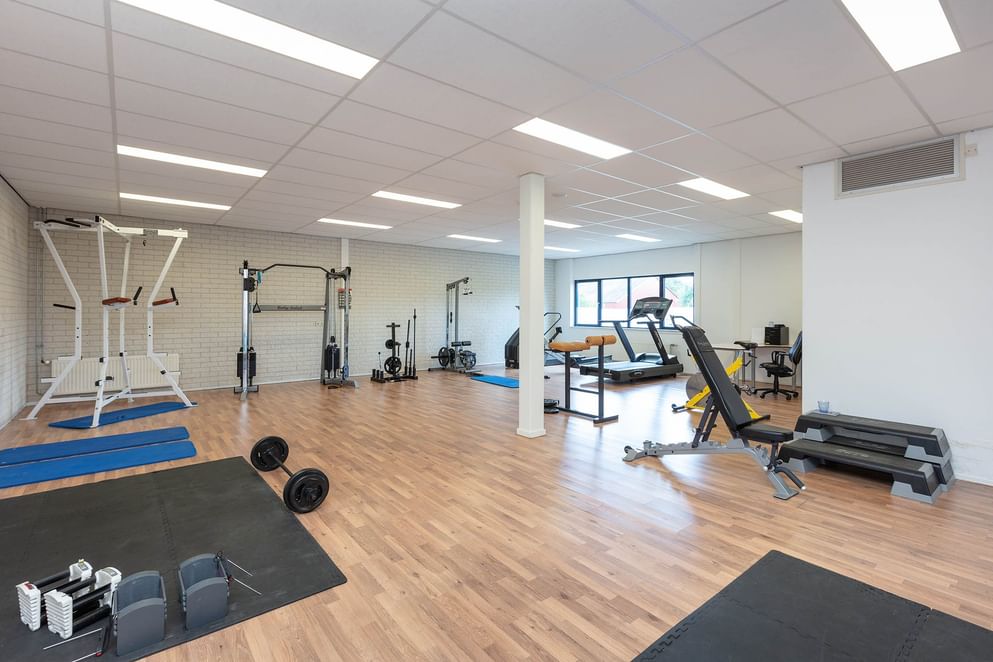 - Eerste verdieping (totale oppervlakte: ca. 377 m²): Overloop, kleedkamer met doucheruimte en toilet (dames), werkkast, 2x trainingszaal waarvan 1 v.v. airconditioning, beautysalon/relaxruimte, kleedruimte met sauna, dompelbad, relaxruimte en toilet, 2x zonnebankruimte.