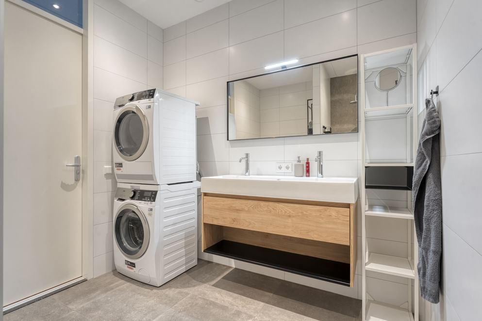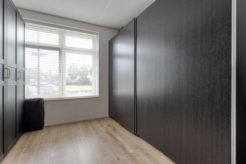 Vanuit de woonkamer is de hoofdslaapkamer bereikbaar die via een deur in verbinding staat met de badkamer. De badkamer is ruim en voorzien van alle gemakken, zoals een inloopdouche, wandcloset, dubbele wastafel en aansluiting voor wasmachine en droger.
