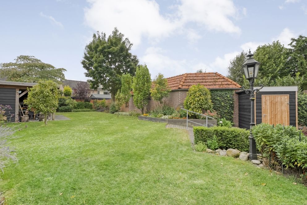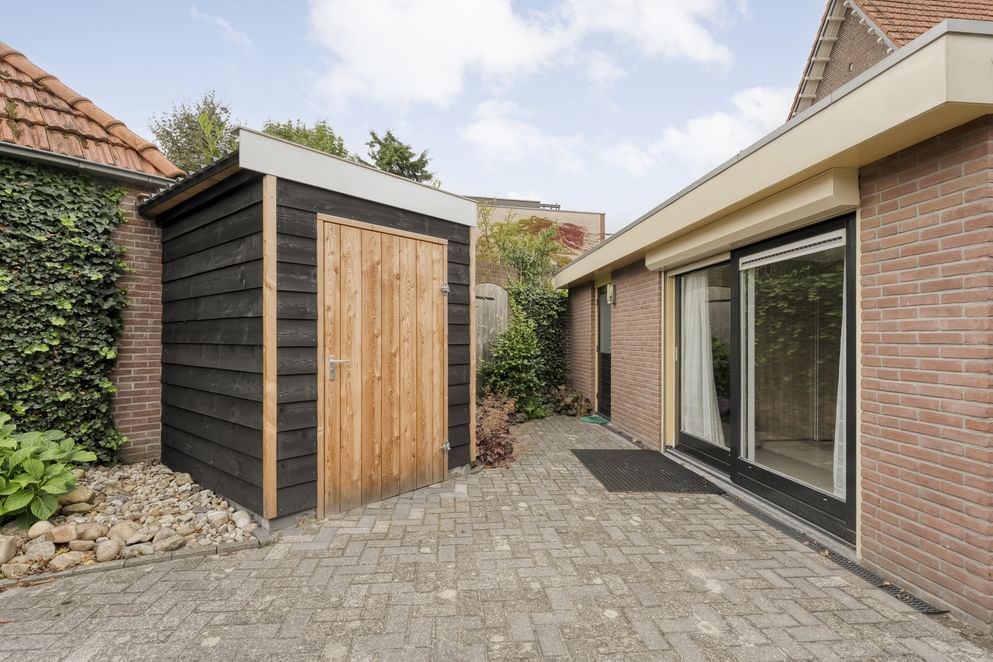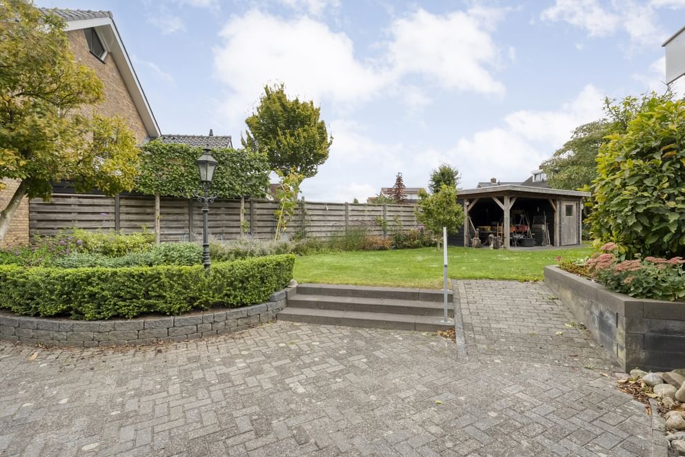 De woning beschikt over een ruime en beschutte tuin met meerdere mogelijkheden voor gebruik en inrichting. Daarnaast zijn er een houten berging en een vrijstaande schuur met overkapping aanwezig.