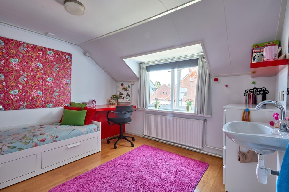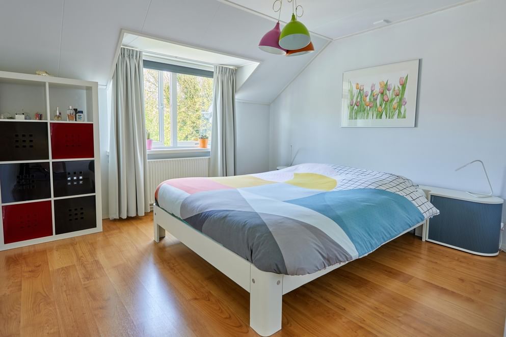 Via de overloop kun je richting de slaapkamers. Op de eerste verdieping zijn er maar liefst vier slaapkamers te vinden. Deze slaapkamers zijn allemaal voorzien van een mooie laminaatvloer. Tevens beschikken de slaapkamers over vaste kasten en heeft een van de kamers zelf een wastafel met spiegel!