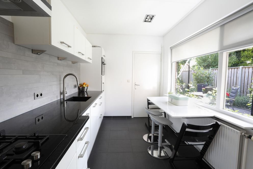 De moderne keuken is tevens aan de achterzijde van de woning te vinden. Deze is voorzien van diverse inbouwapparatuur, zoals een combimagnetron, vaatwasser, koelkast en kookplaat. Verder is er een grote raampartij, waardoor het lekker licht is. In de keuken is een vaste tafel aanwezig, waardoor er ook hier ruimte is om te eten. Achter de keuken is nog een extra ruimte met de witgoedaansluitingen. Deze ruimte is zelfs nog om te bouwen tot extra badkamer of toilet.