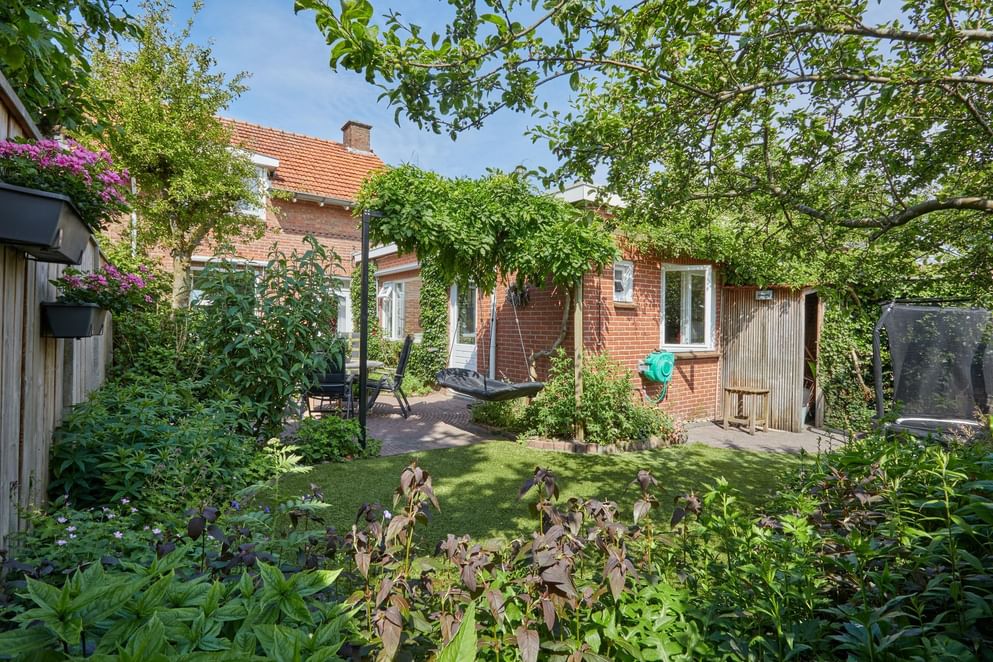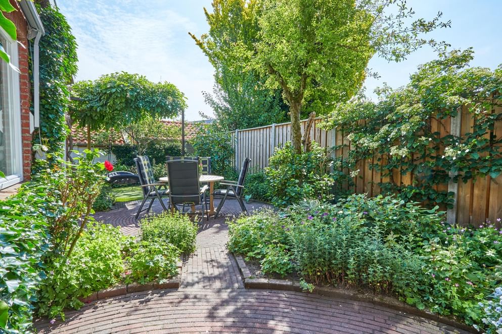 De achtertuin is fraai aangelegd met veel groen en verschillende terrasjes.