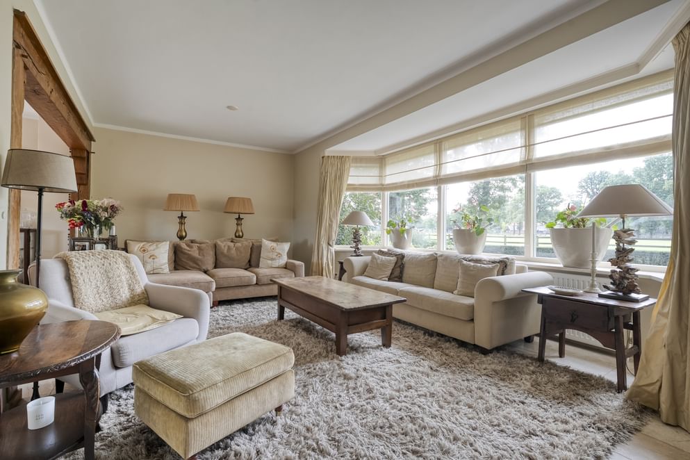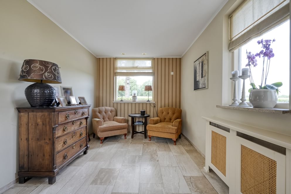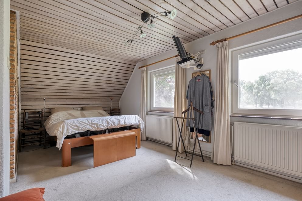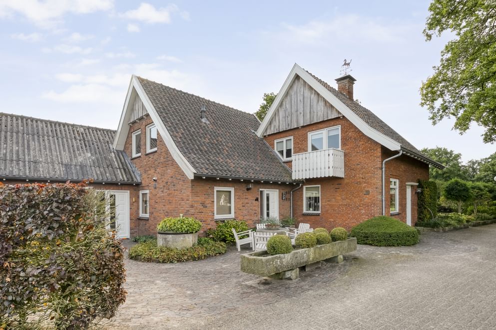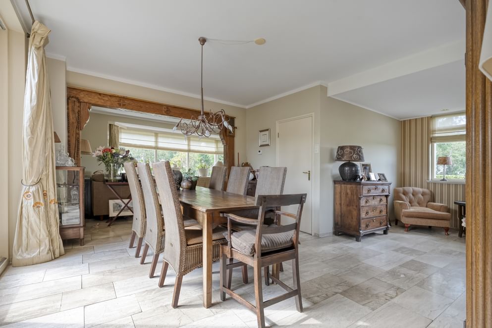 De woning is gebouwd in 1955 en door de jaren heen zorgvuldig onderhouden en gemoderniseerd. De lichte woonkamer van kijkt uit over de strakke tuin en het achterliggende landschap. Dankzij de schuifpui geniet je hier het hele jaar door van de verbinding tussen binnen en buiten. Aansluitend vind je de royale woonkeuken, waar ruimte is voor een grote eettafel en waar het gezin samen kan komen. Wat deze plek bijzonder maakt, is de ligging: aan een rustige weg, buiten de bebouwde kom en met volledig vrij uitzicht. Rondom de woning ligt een grote tuin met diverse terrassen, een gazon en fraaie beplanting. Op het erf bevindt zich bovendien een paardenstal met maar liefst acht paardenboxen. Ook buiten zijn de benodigde faciliteiten voor de paardenliefhebbers: een buitenbak en een ruim perceel grasland. Is het huiskavel niet groot genoeg? Aan de overzijde ligt een perceel van ruim 1,6 hectare volledig in hout omheind grasland wat optioneel bij te kopen is.
