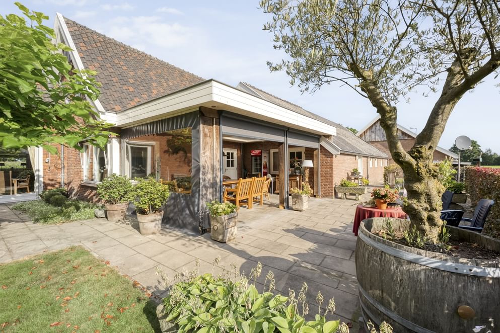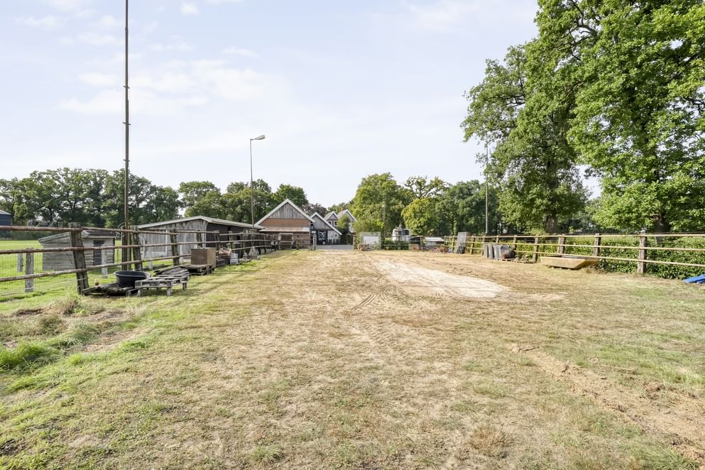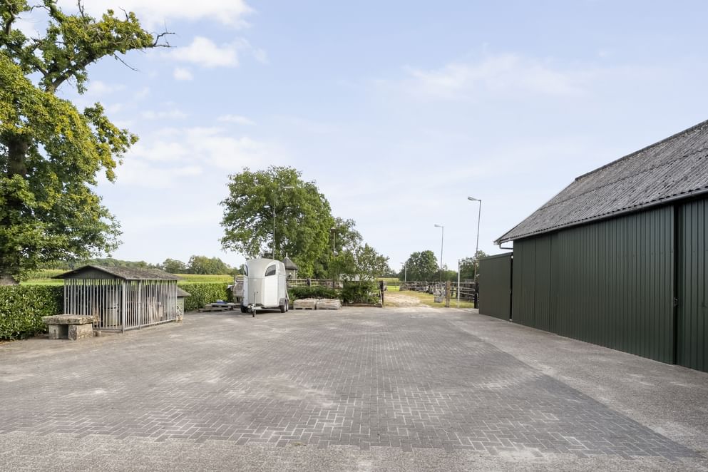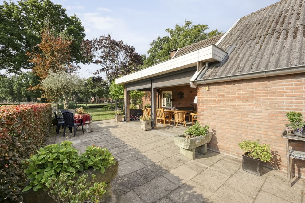 Rondom de woning ligt een royale tuin met een sfeervolle overkapping, die uitgerust is met een elektrisch zeil. Een heerlijke plek om in alle rust van het uitzicht te genieten of samen met familie en vrienden een drankje te doen. Op het erf bevindt zich daarnaast een grote aangebouwde garage, met ruimte voor het parkeren van twee auto’s én volop mogelijkheden voor opslag of hobby’s. Achter op het erf staan bovendien een ruime paardenstal en een grote berging, wat het mogelijk maakt om paarden te stallen op het erf.