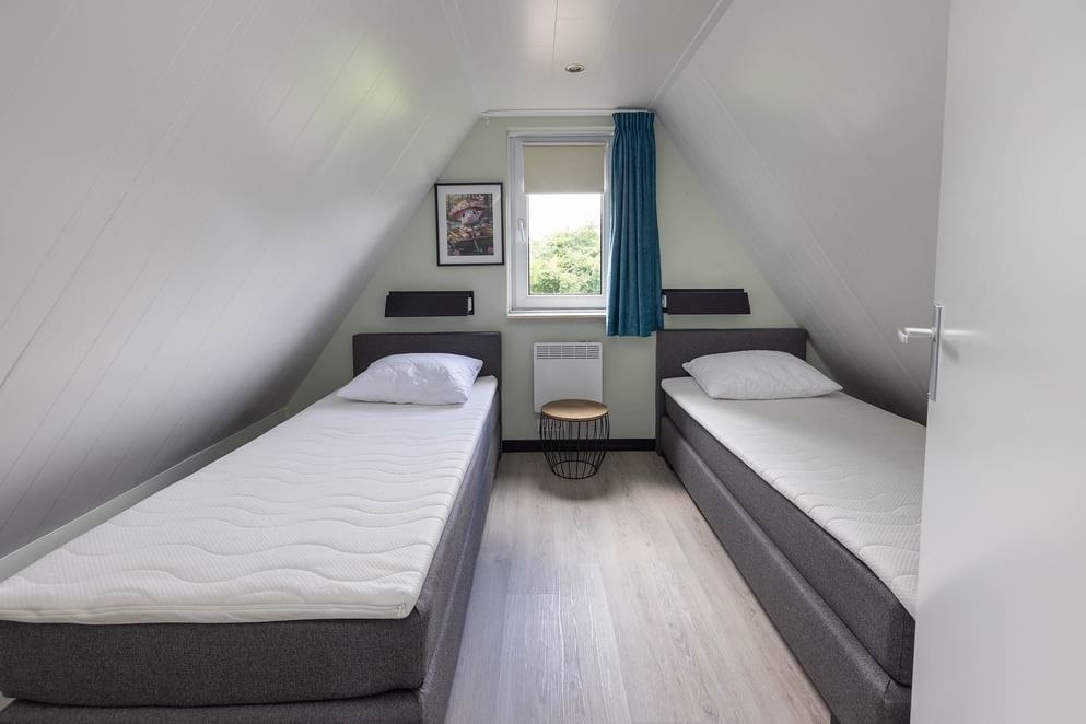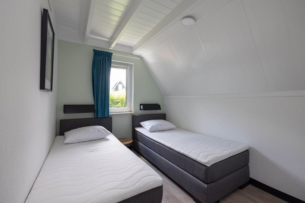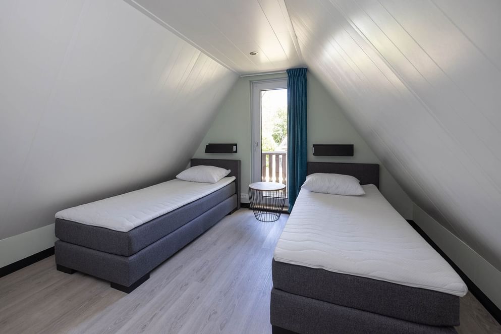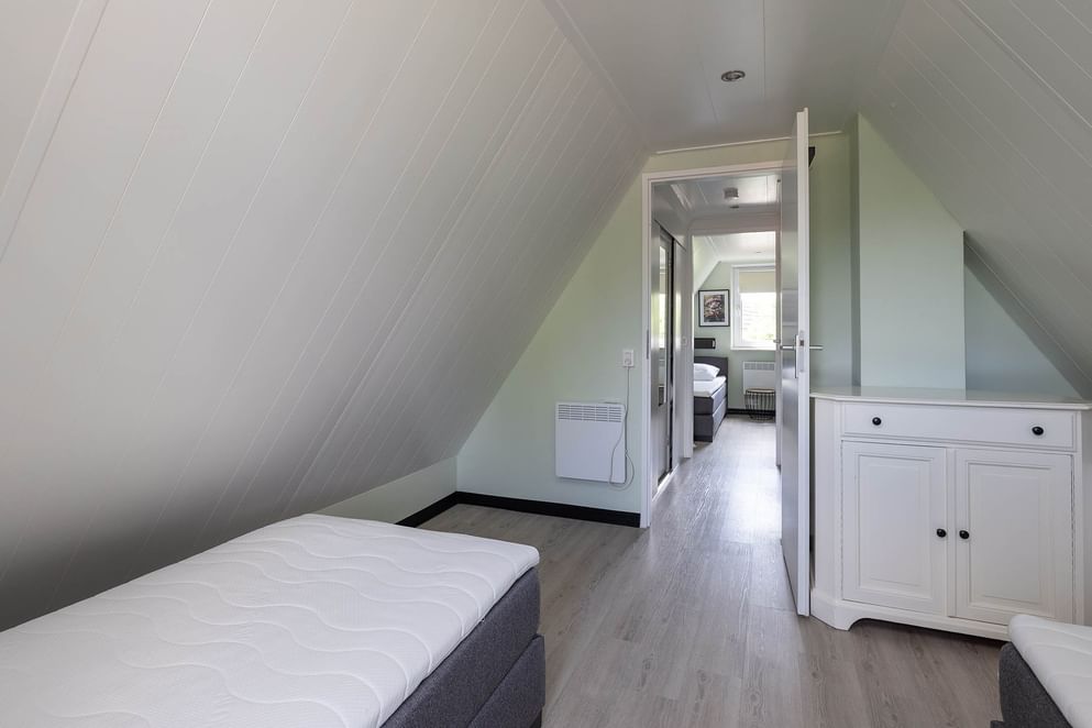 Via een vaste trap kom je op de overloop met twee slaapkamers, waarvan één met balkon en prachtig uitzicht over het water.