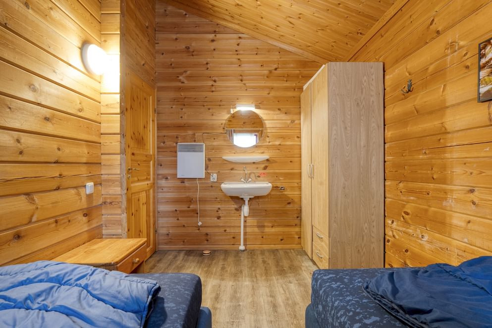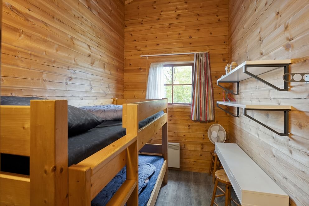 Je betreedt de bungalow aan de zijkant. In de hal vind je het toilet en deuren naar de drie slaapkamers, de badkamer en de doorloop naar de woonkamer met open keuken. Twee slaapkamers zijn ingericht met twee eenpersoonsbedden, de derde met een stapelbed. Eén van de kamers beschikt bovendien over een vaste kast en een wastafel. De woonkamer staat in open verbinding met de keuken, die is uitgerust met een 4-zone inductiekookplaat, afzuigkap, vaatwasser en een koelkast met vriesvak. Er is voldoende ruimte voor een eettafel. Via openslaande deuren bereik je de veranda aan de voorzijde van de bungalow. De vloeren zijn afgewerkt met pvc.