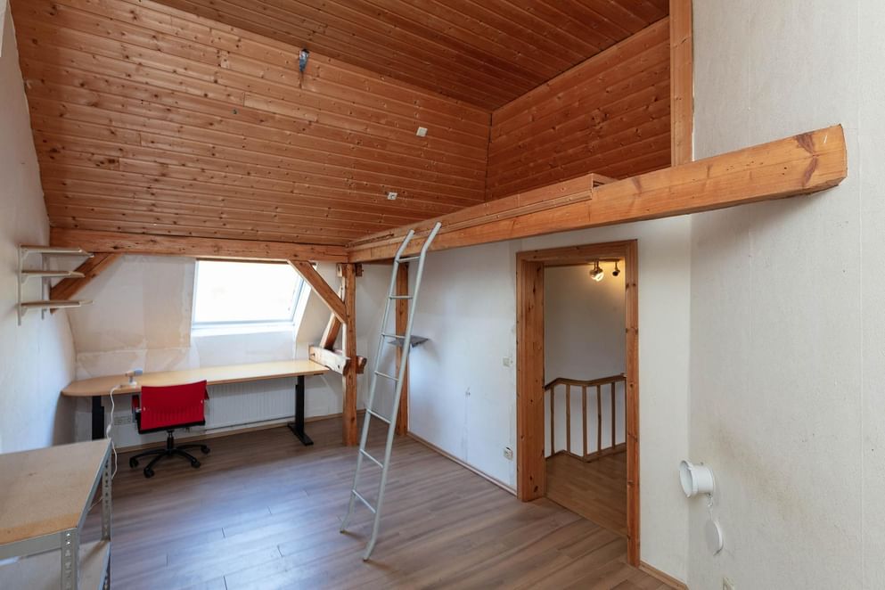 Door middel van een bordestrap te bereiken tweede verdieping welke opgedeeld is in verschillende ruimtes. Aan de voorzijde is een hobby-/slaapkamer met dakvenster, de overige ruimtes met dakvensters zijn niet geheel afgewerkt en kunnen prima dienst doen als opslag. Tevens bieden deze ruimtes de mogelijkheid voor het creëren van extra kamers.