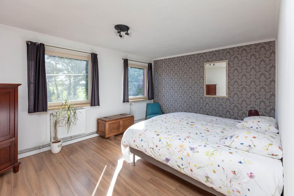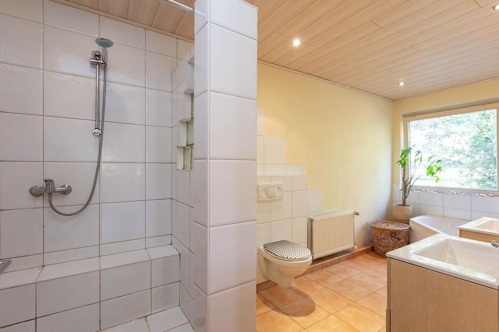 Via de bordestrap bereik je de overloop met daaraan een gang met toegang tot de verschillende kamers. De verdieping beschikt over maar liefst vijf slaapkamers, veelal van verschillende afmetingen. Achterin de gang aan de voorzijde is de badkamer, een prima ruimte met daglichttoegang door een groot raam. De ruimte beschikt over een hoekbad, inloopdouche, wandcloset, een dubbele wastafel met meubel en vloerverwarming.