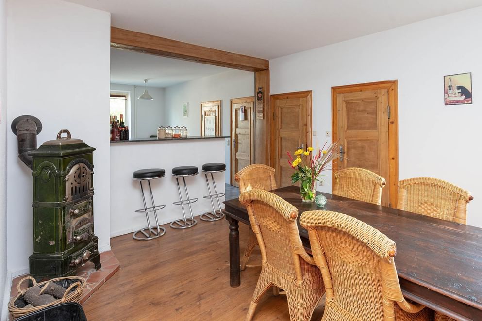 Via enkele traptreden betreed je de woning overdekt aan de voorzijde en kom je binnen in de hal met trappen naar de verschillende verdiepingen. De sfeervolle woonkamer met eikenhouten vloer en het in het oog springend gebintwerk is een prettige ruimte door onder andere de hoge ramen die zorgen voor veel lichtinval. Deze sfeer is doorgetrokken in de royale woonkeuken welke voorzien is van een inbouwkeuken (2017) met Bordeauxrode fronten en een granieten werkblad. Uiteraard is de keuken voorzien van vele gemakken als een inductie kookplaat met daarboven een afzuigkap, een oven, royale koelkast en vaatwasser. Prettige bijkomstigheid zijn de twee vaste provisiekasten/ruimtes, ideaal voor het bergen van jouw voorraad. Via het barretje aan het keukenblok loop je het eetgedeelte binnen, een praktische ruimte voor een 6-persoons eettafel naast de authentieke houtkachel. Aansluitend is er een hobby-/werkruimte welke momenteel dienst doet als kantoor.