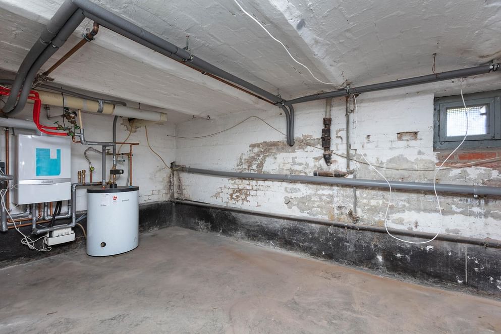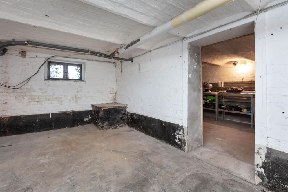 De kelderruimte bevindt zich onder het woongedeelte en is opgedeeld in 6 compartimenten, het merendeel van de ruimtes is voorzien van daglichttoegang. Hier bevindt zich ook de C.V.-installatie en de boiler.