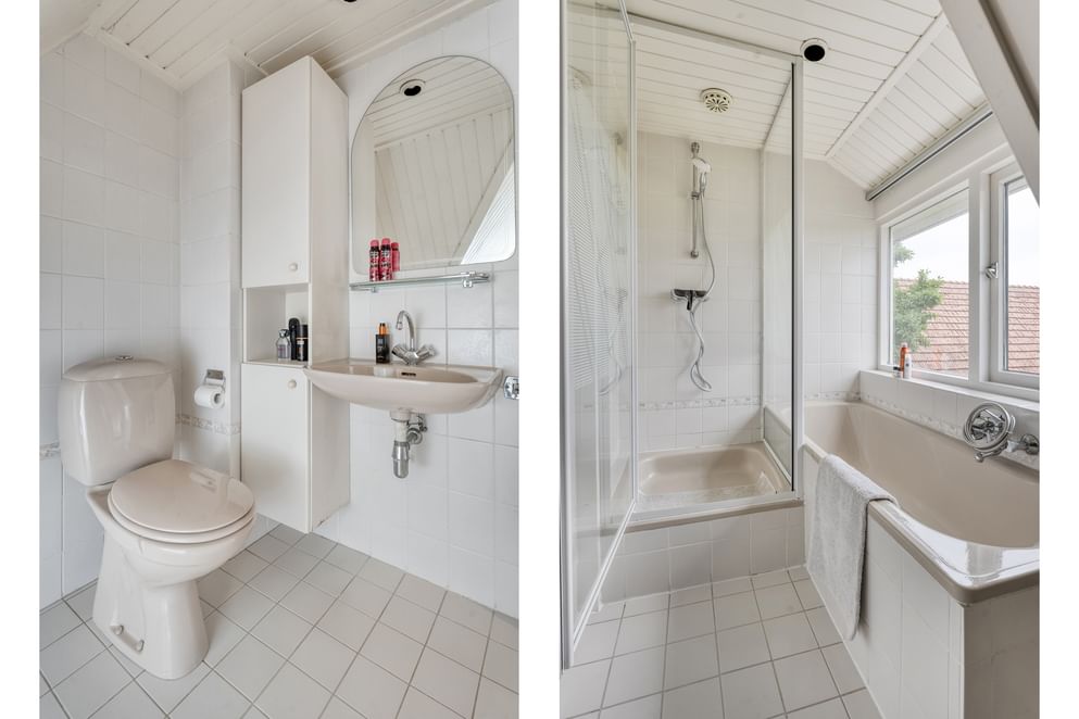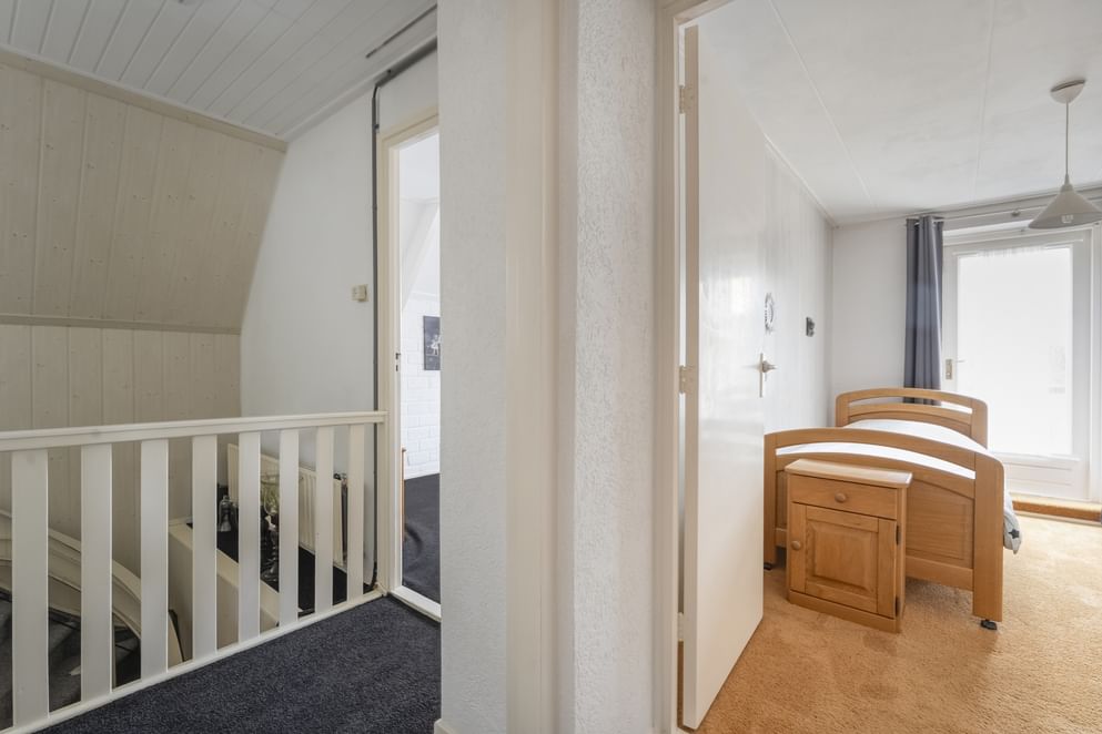 Via de vaste trap in de entree kom je op de eerste overloop. Hier bevindt zich de eerste badkamer met toilet en zijn de drie slaapkamers van gelijk formaat gesitueerd, deze kamers beschikken allemaal over inbouwkasten. Vanuit de middelste slaapkamer bereik je de tweede overloop aan de achterzijde van de woning. Hier bevindt zich de tweede badkamer met ligbad, douchecabine en toilet. Ook de master bedroom bevindt zich hier, ruim van opzet en voorzien van vaste kastruimte. Aan het einde van deze overloop bevindt zich de spiltrap die toegang biedt tot het achter portaal op de begane grond.