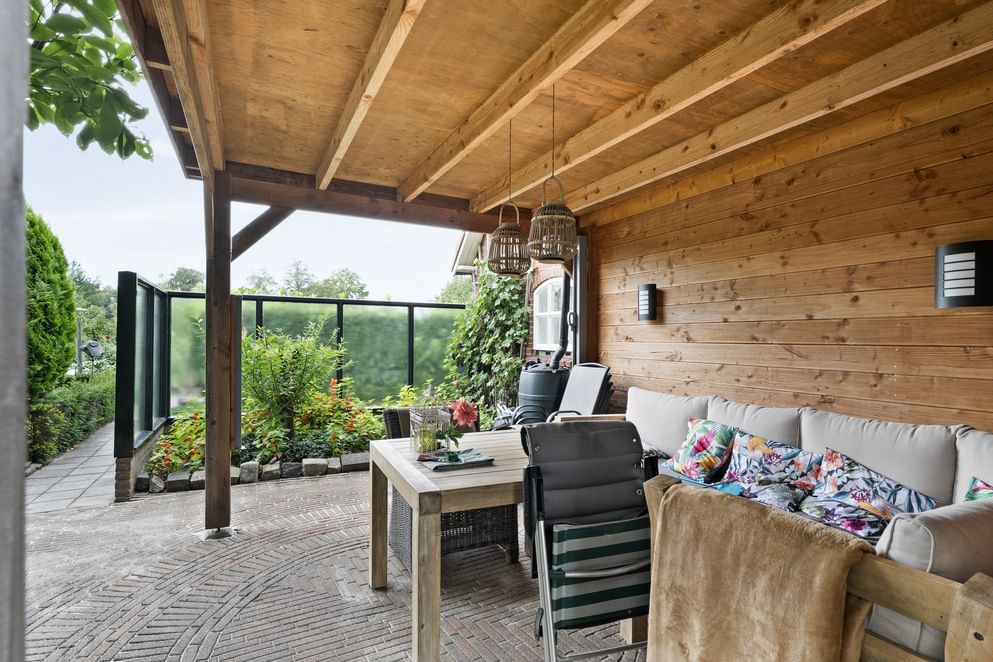 Op het perceel staat een ruime vrijstaande stenen schuur, gebouwd in spouw en voorzien van een betonvloer en een betonnen verdiepingsvloer. Deze ruimte is ingericht met een werkplaats, extra keukenblok en eigen zithoek, en wordt verwarmd met een gaskachel. Ideaal voor hobbyisten, praktijk aan huis of atelier. Aan de achterkant van de garage bevindt zich een aangebouwde carport en aan de tuinzijde een prachtig overdekt terras.