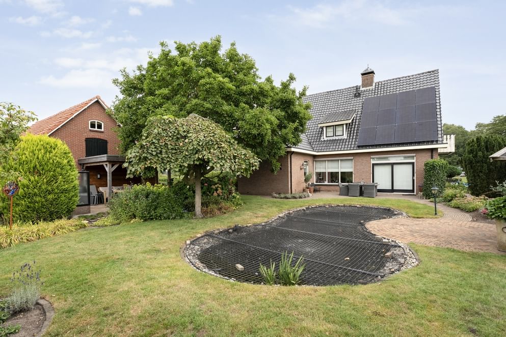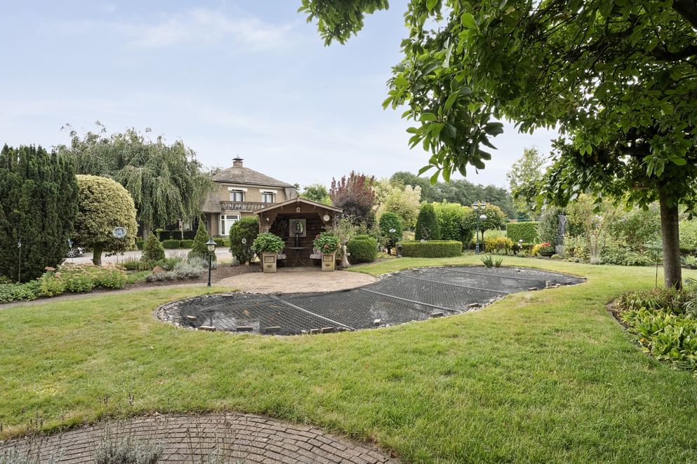De tuin bevindt zich rondom de woning en is zeer goed onderhouden. Er is een groot gazon, gevarieerde volgroeide beplanting en een grote vijver die samen zorgen voor een groene en ontspannen sfeer. Aan de achterzijde van het perceel bevinden zich bovendien een moestuin en het aangrenzende weiland. Dankzij de ligging aan de bosrand is rust hier vanzelfsprekend. De oprit biedt plaats aan meerdere auto's en leidt naar de vrijstaande garage met carport.