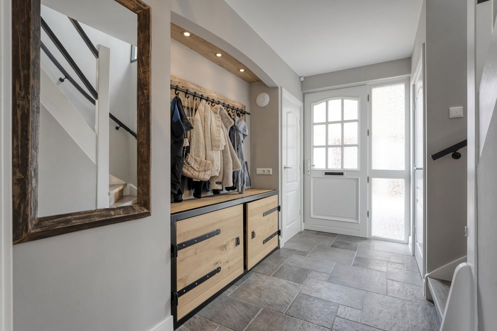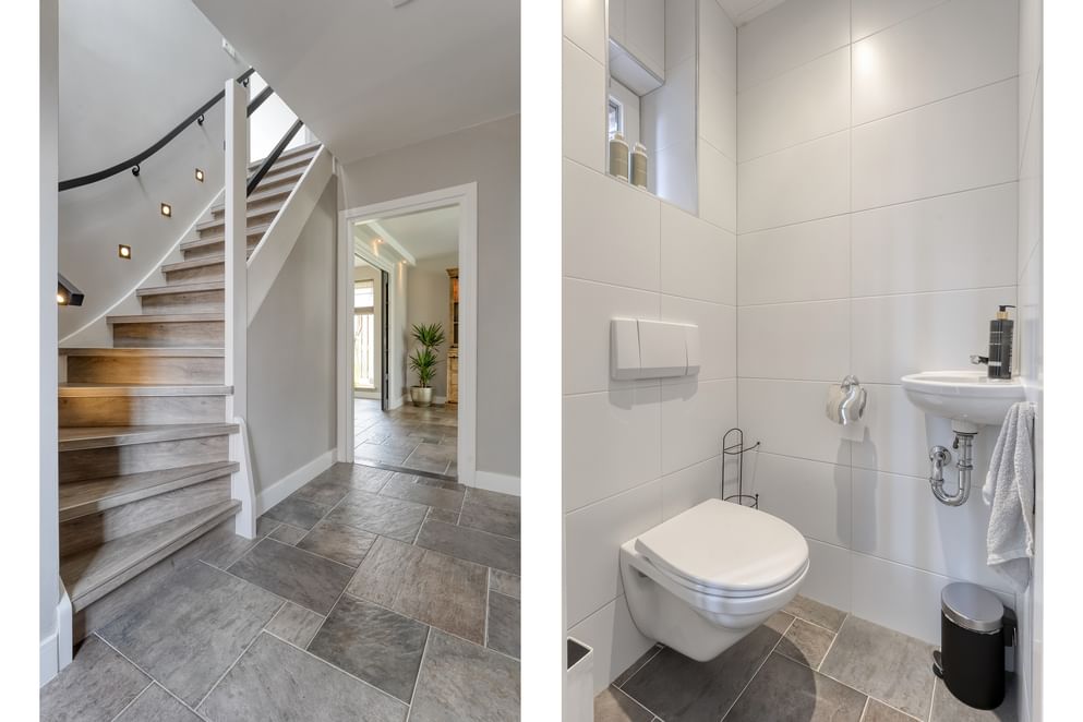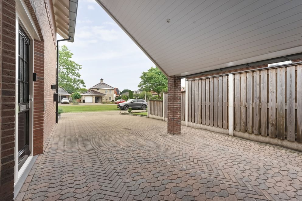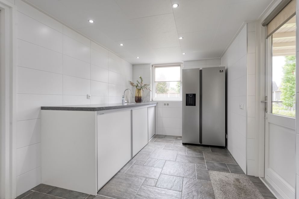 Je parkeert gemakkelijk op de ruime oprit, met plek voor meerdere auto's. Bij binnenkomst stap je in de hal, waar je toegang hebt tot het toilet met fonteintje, een garderobenis, de meterkast en de trap naar de eerste verdieping. Vanuit de hal loop je door naar de ruime woonkamer in L-vorm. Deze leefruimte is licht en sfeervol dankzij de vele raampartijen en de gezellige gashaard die het geheel een warme uitstraling geeft. Via een schuifdeur kom je in de woonkeuken, die in 2020 volledig is vernieuwd. De keuken is uitgerust met diverse inbouwapparatuur, waaronder een inductiekookplaat met vier zones, een RVS spoelbak, een combi-oven, koelkast en vaatwasser. Vanuit de keuken is er toegang tot de bijkeuken, waar een extra keukenblok met RVS spoelbak en voldoende opbergruimte aanwezig is.