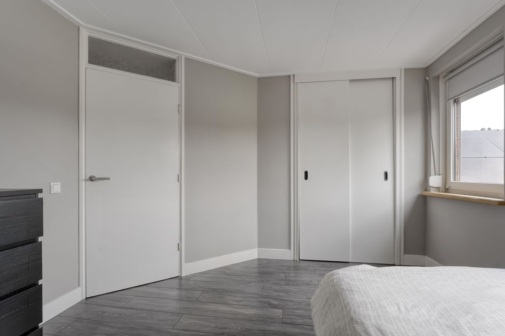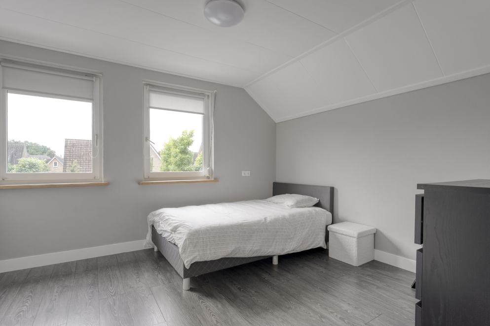 Via de vaste trap bereik je de eerste verdieping. De overloop en alle vertrekken zijn voorzien van nieuw laminaat, wat zorgt voor een frisse en verzorgde uitstraling. Er zijn in totaal vier slaapkamers, elk met hun eigen kenmerken. De slaapkamer aan de voorzijde is uitgerust met screens, terwijl de slaapkamer rechtsachter is voorzien van vaste kasten en rolluiken. Ook de slaapkamer linksvoor beschikt over vier praktische vaste kasten, ideaal voor extra bergruimte. De vierde slaapkamer is wat compacter van formaat en daardoor ook zeer geschikt als werkkamer of thuiskantoor. De moderne en ruime badkamer is compleet uitgevoerd met een dubbele wastafel, een inloopdouche, een wandcloset en volledige vloerverwarming voor extra comfort.