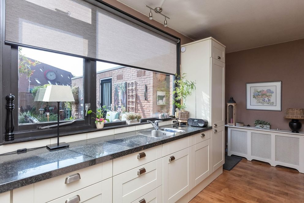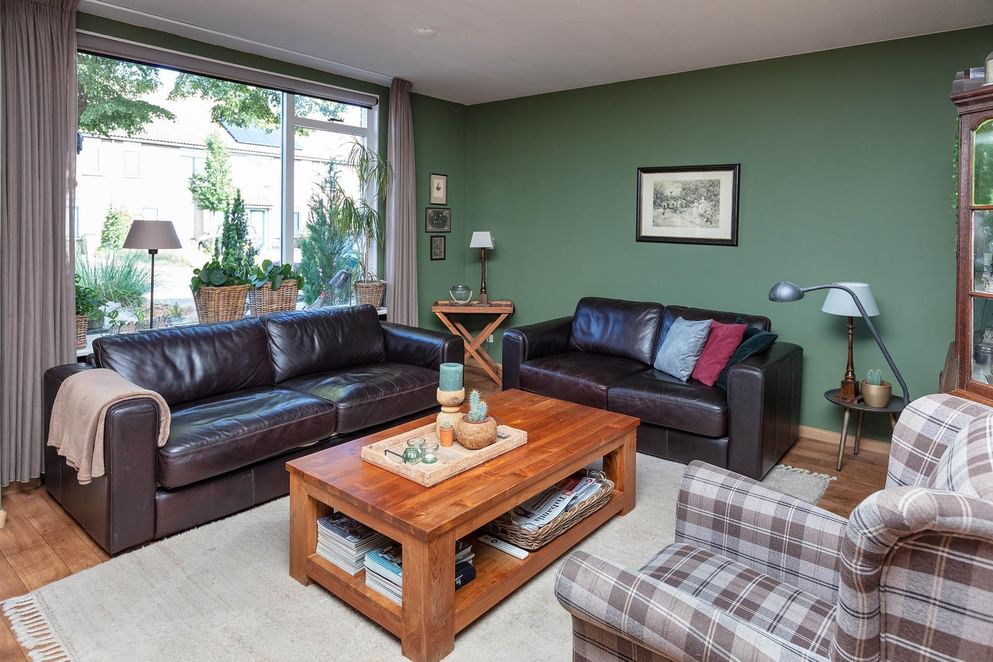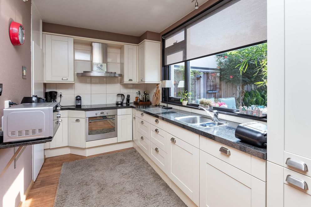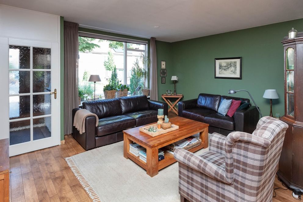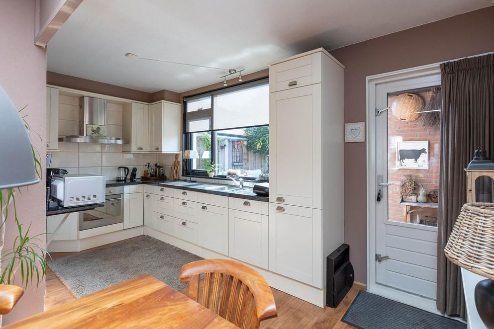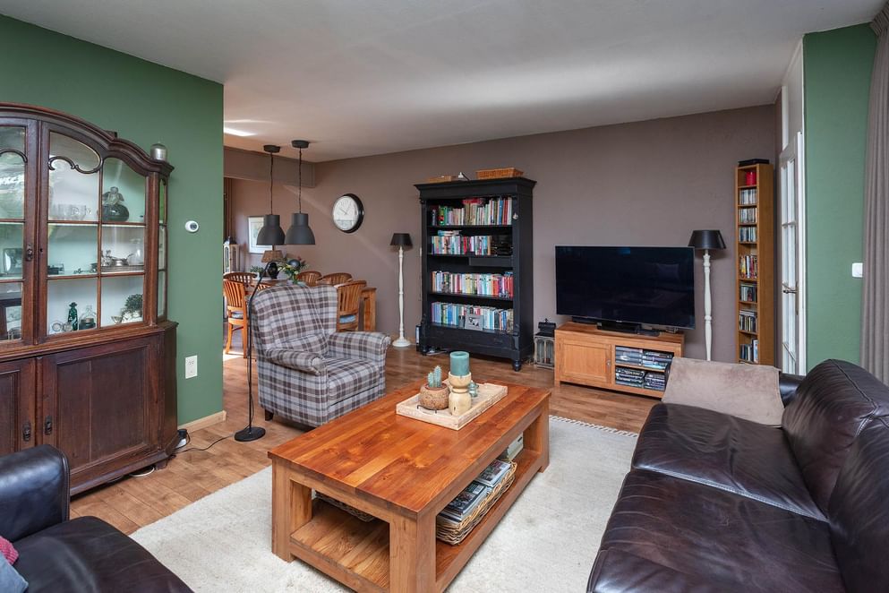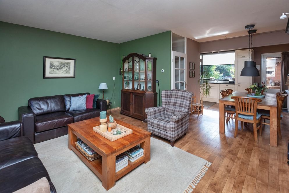 Via de hal heb je toegang tot de meterkast en de leefruimte. De woonkamer is aan de voorkant van de woning gesitueerd. De grote raampartijen zorgt voor veel licht in de woning. Wanneer je doorloopt naar achteren is er ruimte voor de eettafel. Tevens vind je hier de L-vormige keukenunit met oven, spoelbak, RVS afzuigkap, koelkast en inductiekookplaat. Vanuit de keuken is er een doorgang middels een tuindeur naar de groene tuin met vijver en voldoende zitruimte op het terras met zonnescherm. Tevens bevindt zich in de tuin een berging met voldoende opslagruimte.
