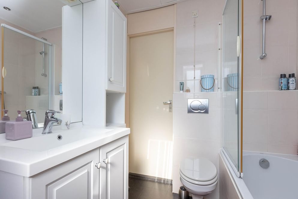 Op de eerste verdieping zijn vanaf de overloop drie slaapkamers en de badkamer te bereiken. De badkamer is voorzien van ligbad met douche, toilet, designradiator en een wastafelmeubel met kolomkast.