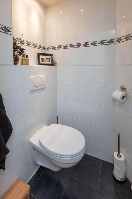 Vanuit de leefruimte is het portaal te bereiken met een modern toiletruimte voorzien van een wandcloset en trap naar de eerste verdieping.