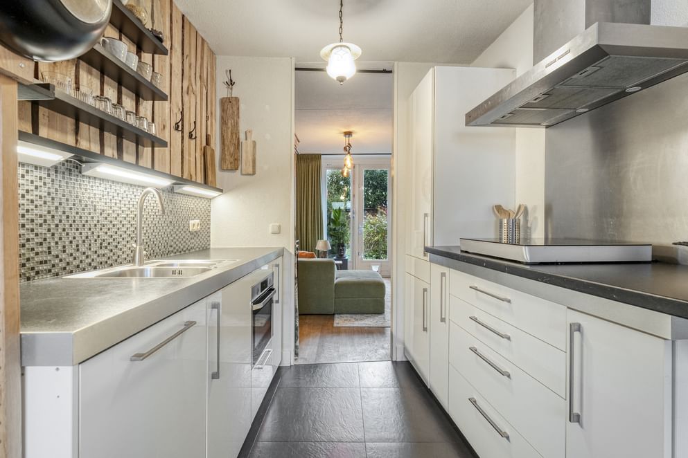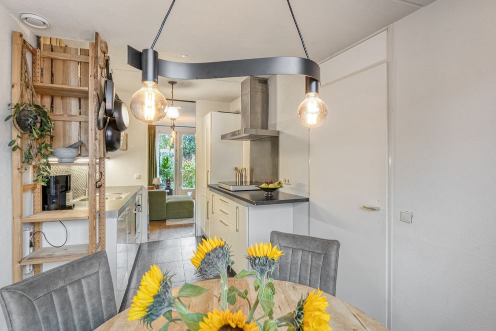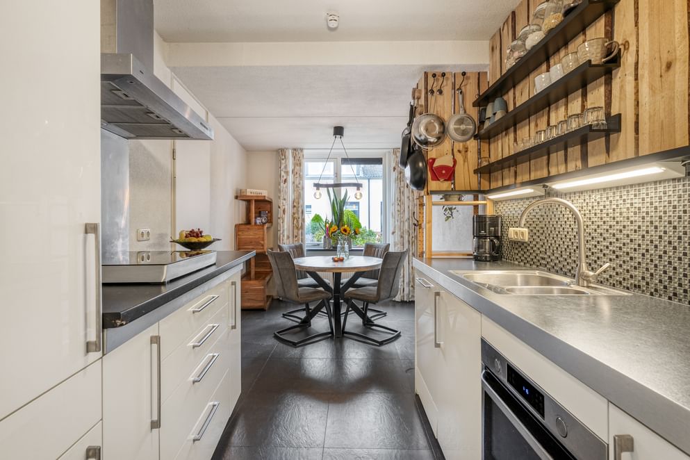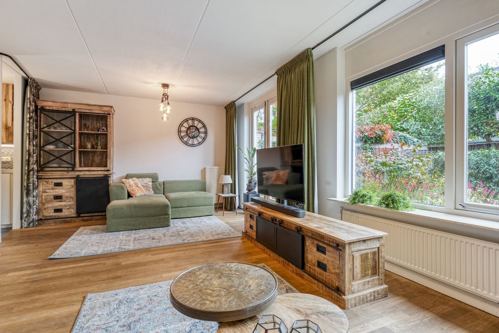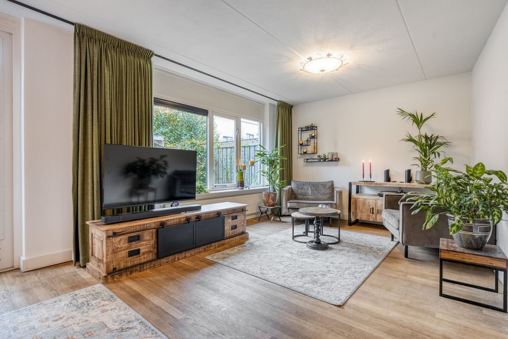 Bij binnenkomst kom je in de ruime hal, waar zich het toilet en de doorgang naar de woonkamer, keuken en berging bevinden. De woonkamer is heerlijk ruim, voorzien van grote ramen en openslaande tuindeuren die zorgen voor veel licht en een directe verbinding met de tuin. De moderne keuken bevindt zich aan de voorzijde van de woning en is compleet uitgerust met een koel-vriescombinatie, elektrische kookplaat, oven, en een vaatwasser (vervangen in 2020). De keuken biedt bovendien voldoende kastruimte. Aansluitend bevindt zich de eethoek met uitzicht op de straatzijde. De inpandige berging is ideaal voor voorraad.