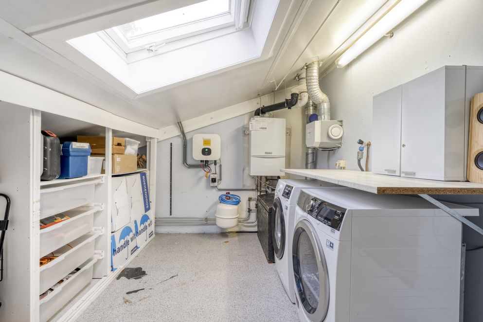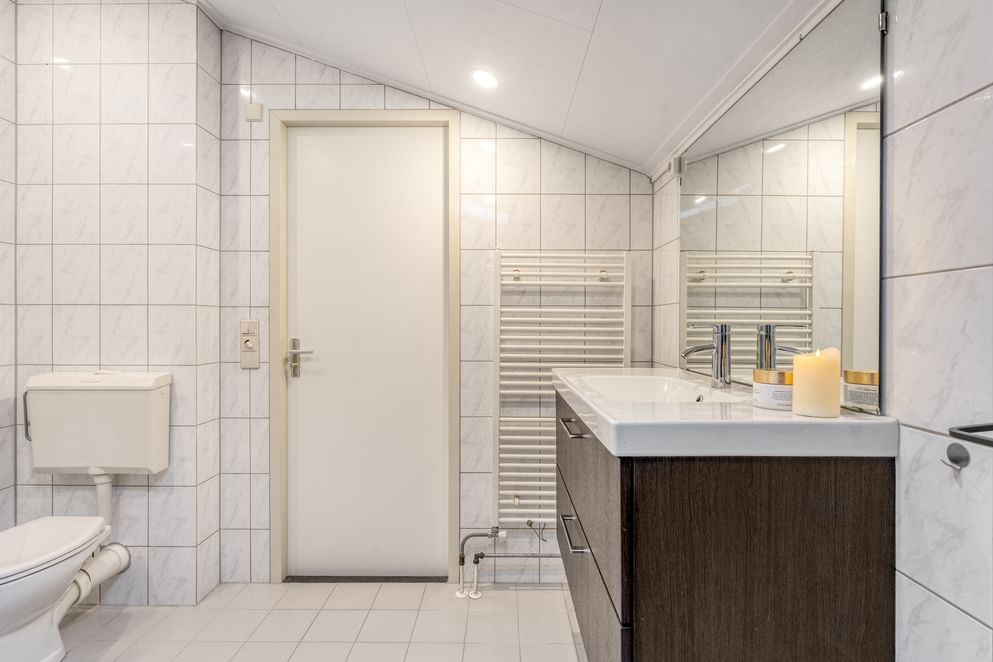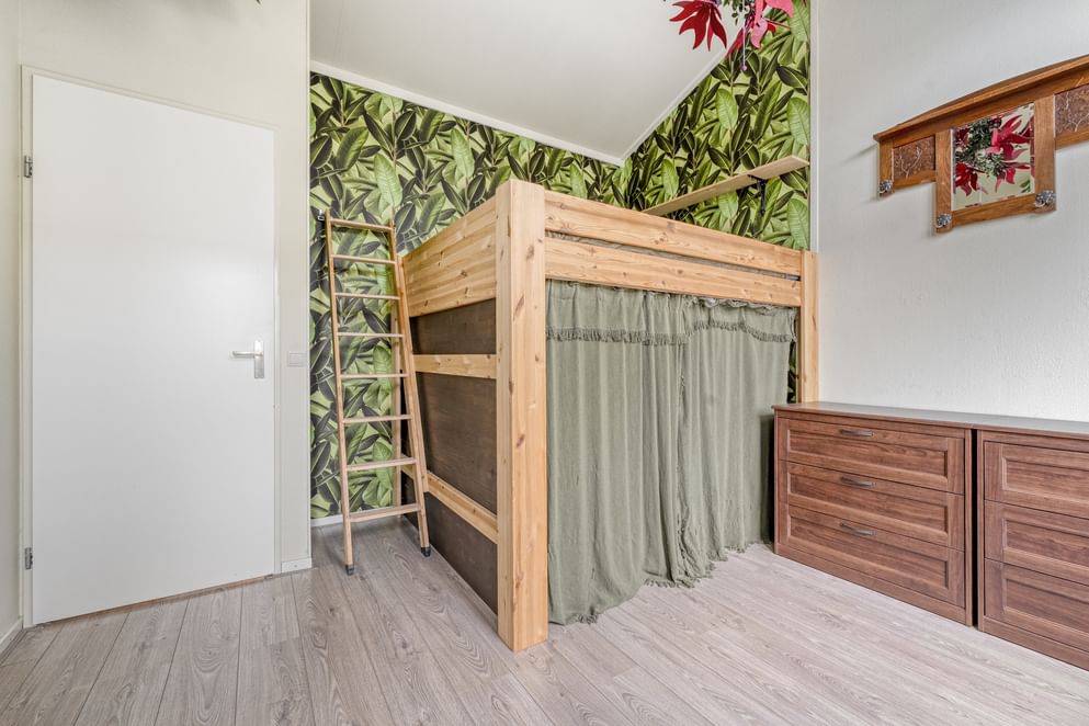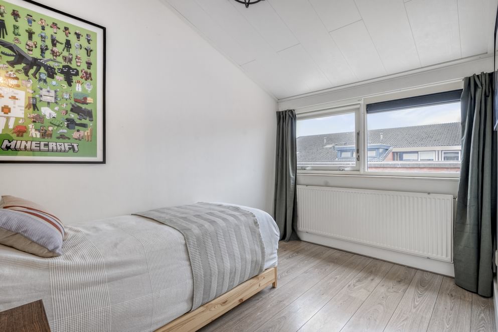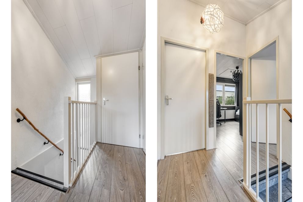 De eerste verdieping beschikt over drie ruime slaapkamers en een volledig uitgeruste badkamer. De badkamer is voorzien van een wastafel met meubel, douchecabine, toilet en mechanische ventilatie. Onder de schuine kap bevindt zich extra bergruimte met de witgoedaansluiting, de cv-installatie, omvormer van de zonnepanelen en voldoende opbergmogelijkheden. De zolder is via een vlizotrap te bereiken en biedt nog meer bergruimte.