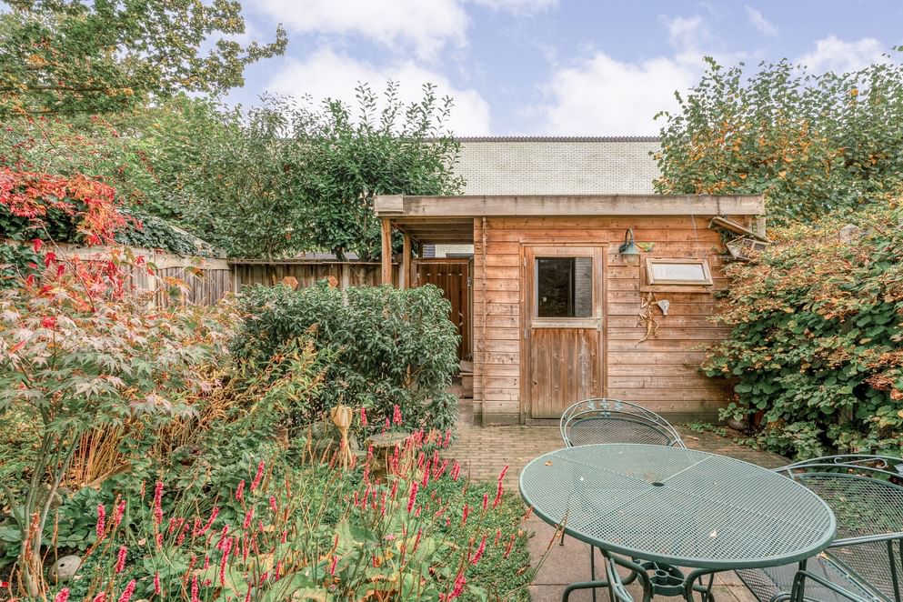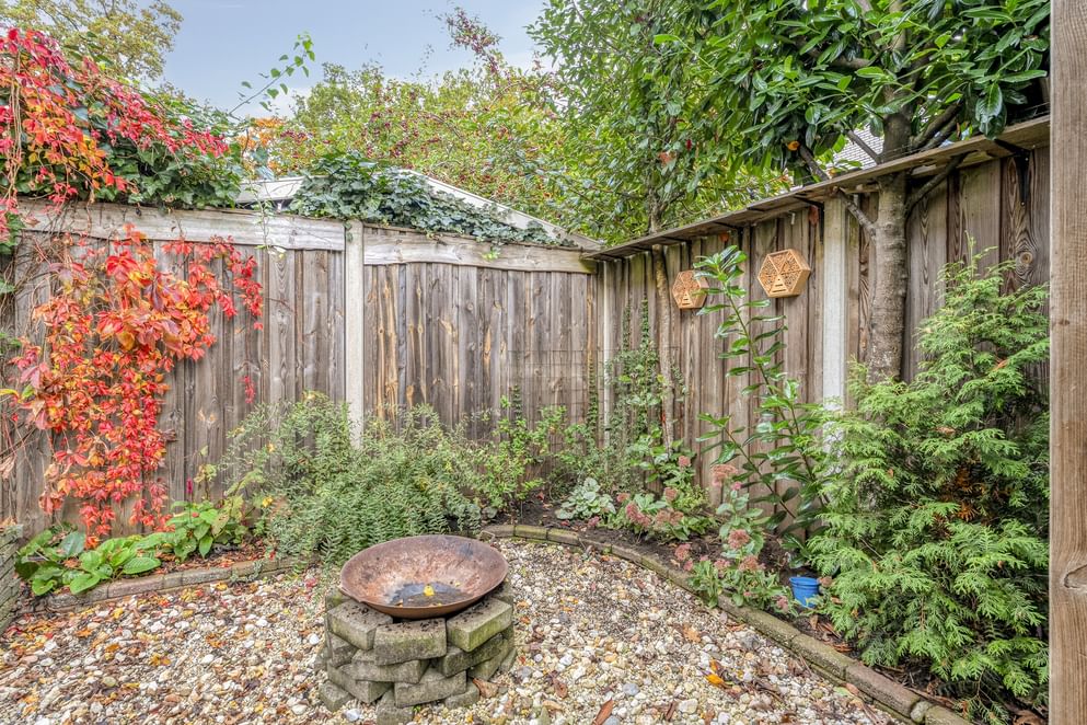 De tuin is gezellig en onderhoudsvriendelijk aangelegd met een combinatie van groen en bestrating. Er is voldoende ruimte voor een tuinset, een gezellige zithoek bij de vuurkorf en een handige berging met achterom, ideaal voor fietsen of tuingereedschap.