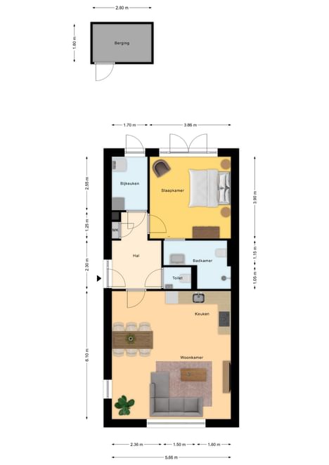 Via de zijkant van het gebouw betreedt je dit prachtige appartement. De ruime hal verwelkomt je en biedt direct toegang tot de moderne open keuken en de lichte woonkamer. Daarnaast beschikt de woning over een handige bijkeuken en een royale slaapkamer met directe toegang tot de badkamer. Met de openslaande deuren in de slaapkamer haal je het buitengevoel naar binnen! Het separate toilet zorgt voor extra gemak.