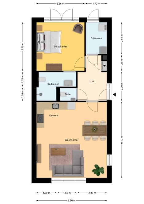 - De appartementen zijn v.v. 1 slaapkamer en 1 bijkeuken