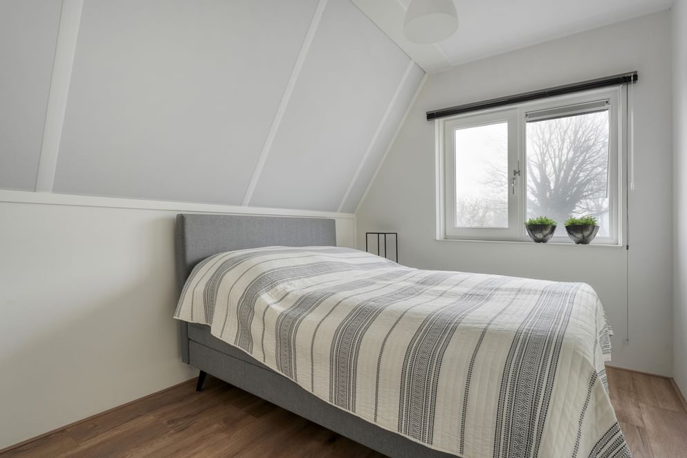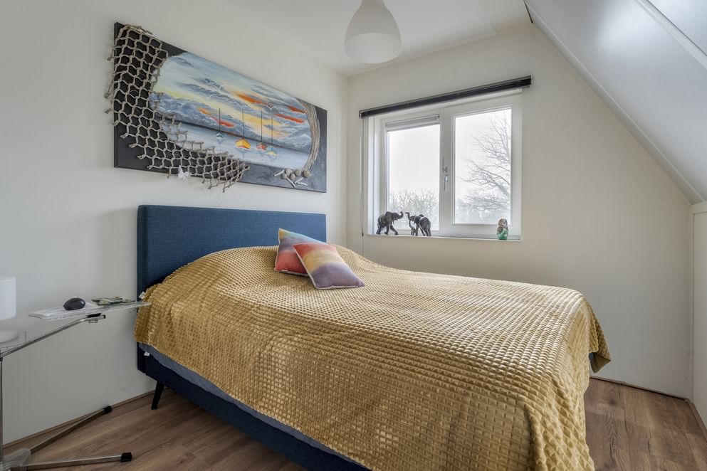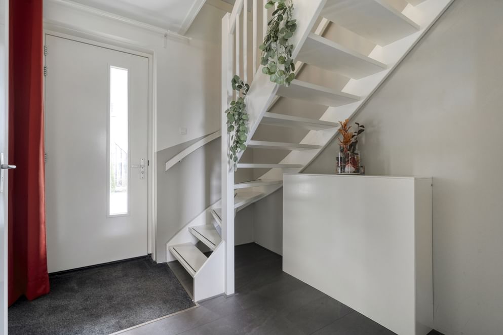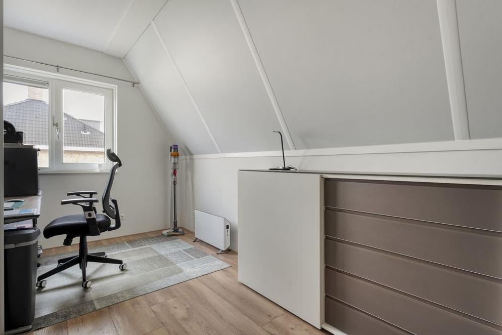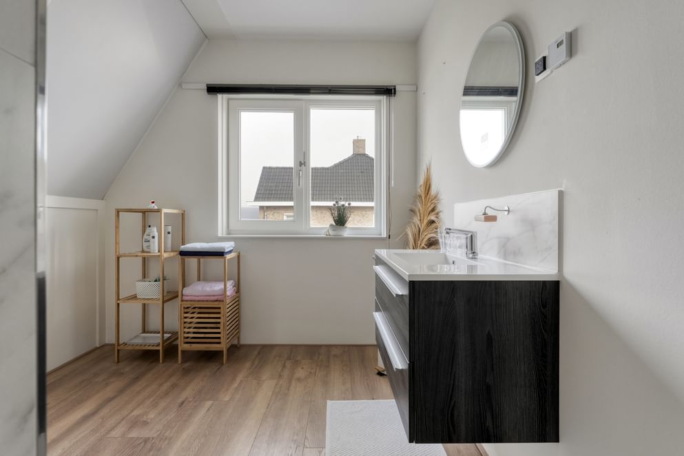 Via de vaste trap bereik je de eerste verdieping. Vanaf de overloop heb je toegang tot de verschillende vertrekken. Op deze verdieping bevinden zich drie volwaardige slaapkamers, allen ruim opgezet en voorzien van raampartijen, wat zorgt voor een prettige lichtinval. De badkamer is praktisch ingericht en beschikt over een douchecabine en een wastafel met meubel. Daarnaast is er op deze verdieping een aparte berging aanwezig, waar onder andere de omvormer voor de zonnepanelen is geplaatst en de mechanische ventilatie.