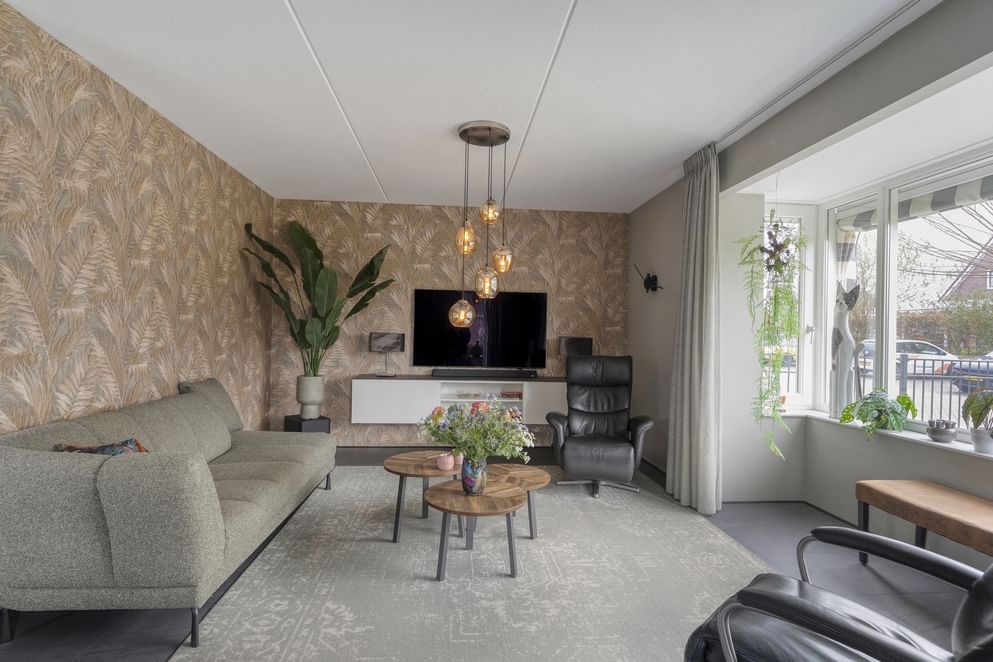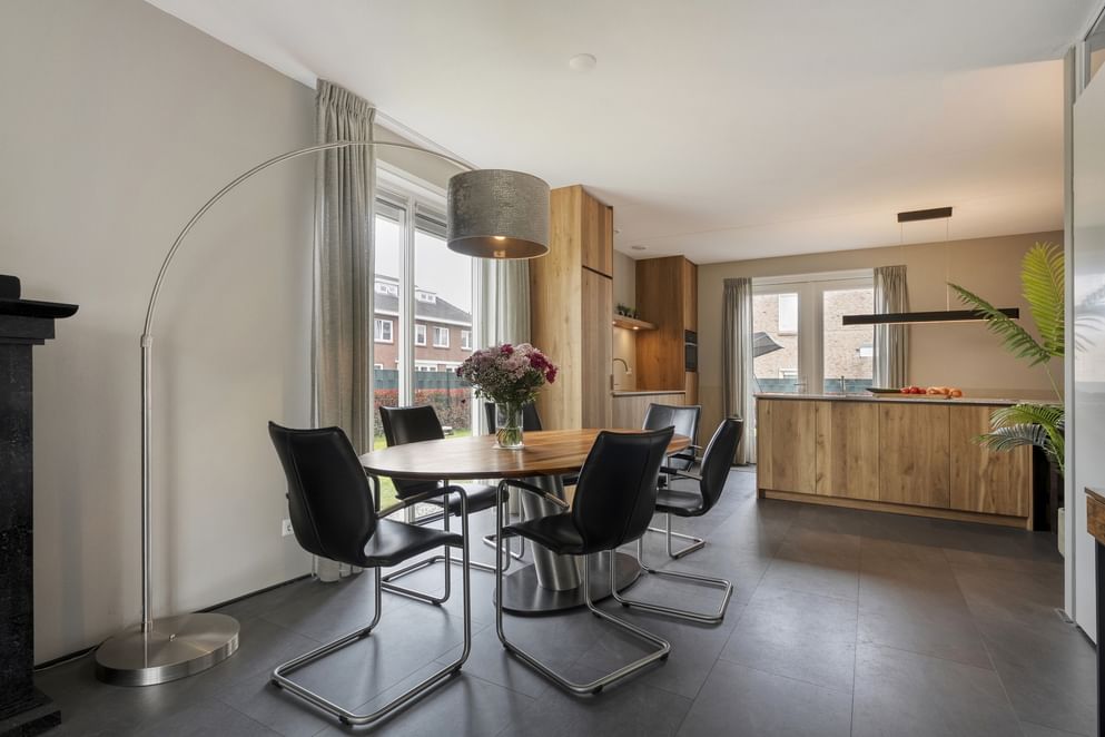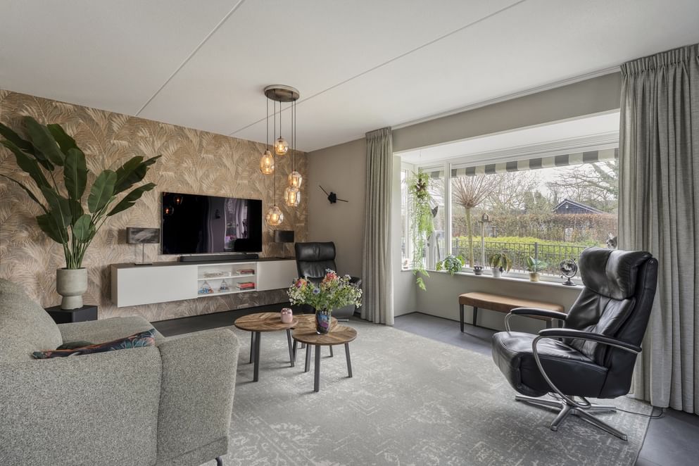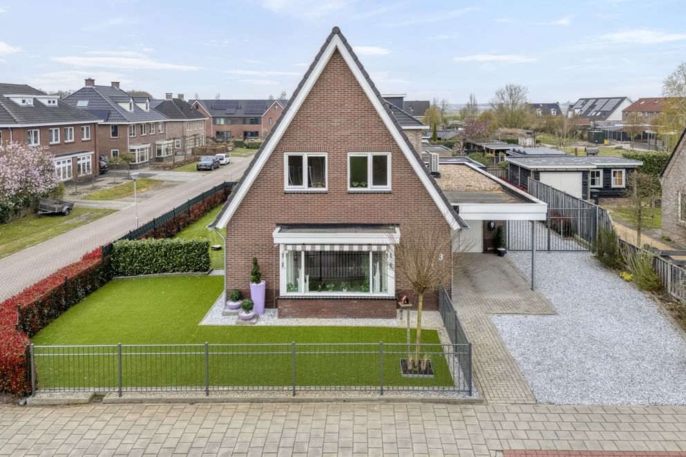Via de voordeur betreed je de ruime entree, waar zich de trapopgang naar de eerste verdieping, het toilet en de meterkast bevinden. Vanuit hier loop je door naar de woonkamer, die aan de voorzijde van de woning is gesitueerd. Dankzij de erker met grote raampartijen geniet je hier van een prettige lichtinval. Daarnaast is de eker uitgerust met markiezen en screens, wat zorgt voor aangename zonwering. De woonkamer staat in open verbinding met de woonkeuken, waardoor er een fijn, open leefruimte ontstaat. De massieve op maat gemaakte keuken is ruim opgezet en vormt een echte eyecatcher dankzij het grote kookeiland. Daarnaast is de keuken voorzien van diverse Miele inbouwapparatuur. Ook hier zorgen de vele raampartijen voor een aangename lichtinval. Vanuit de keuken bereik je de slaapkamer op de begane grond, gelegen aan de achterzijde van de woning. Aansluitend vind je de badkamer, die is uitgerust met een inloopdouche en een wastafel met meubel. Tot slot beschikt de woning over een praktische berging, bereikbaar via de carport, waar zich ook de laadpaal bevindt. De berging biedt volop ruimte voor het stallen van fietsen en het opbergen van diverse spullen. Hier bevindt zich tevens de warmtepomp en geïntegreerde boiler.