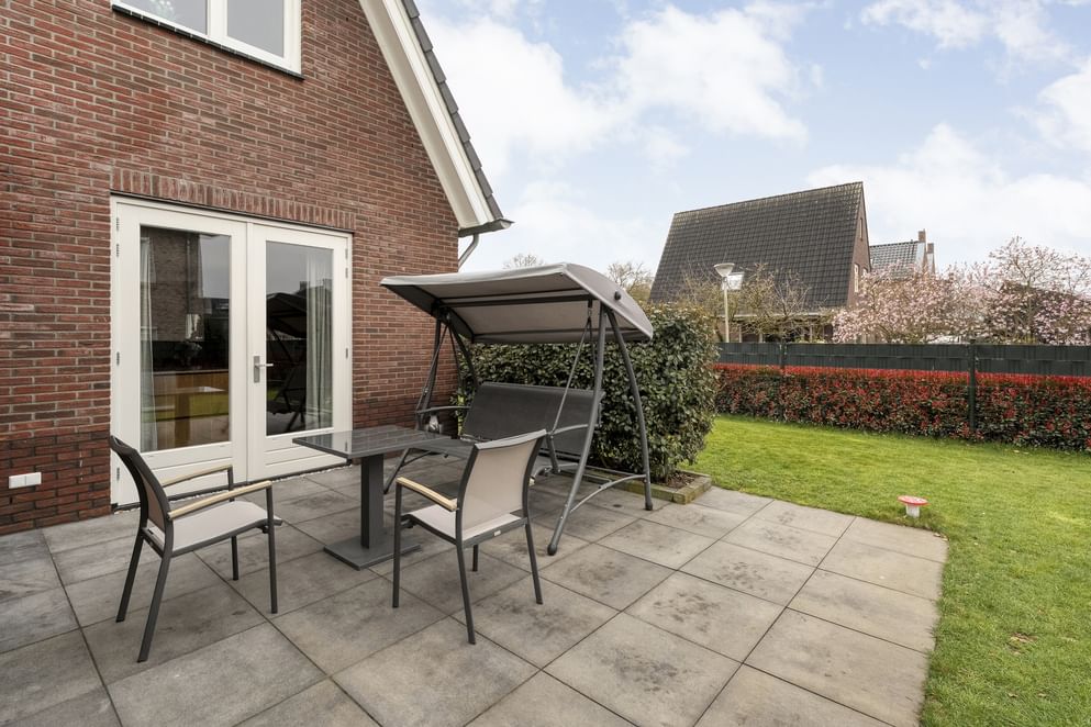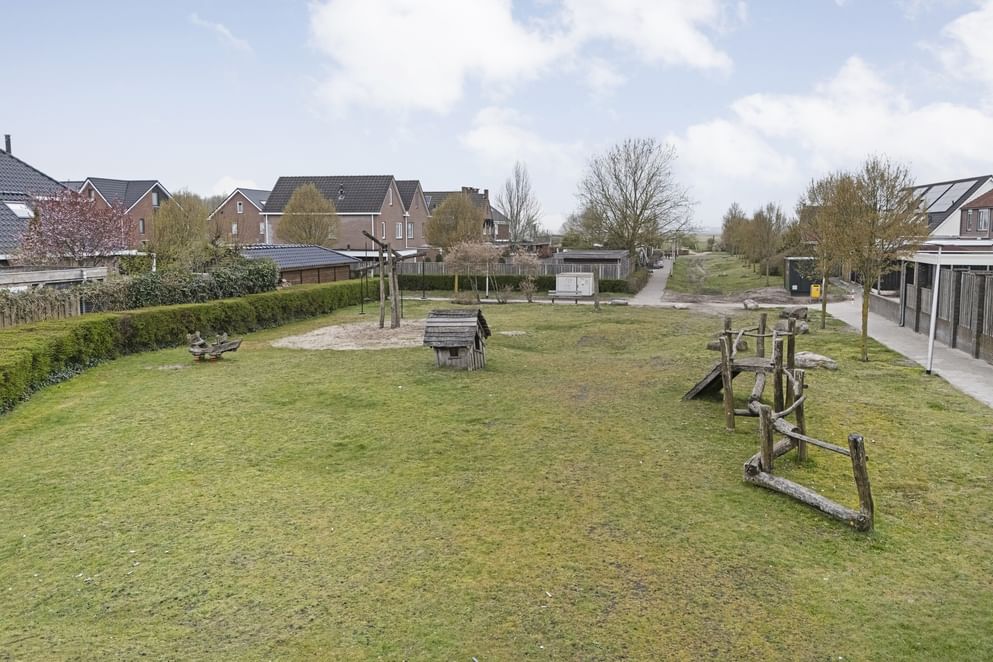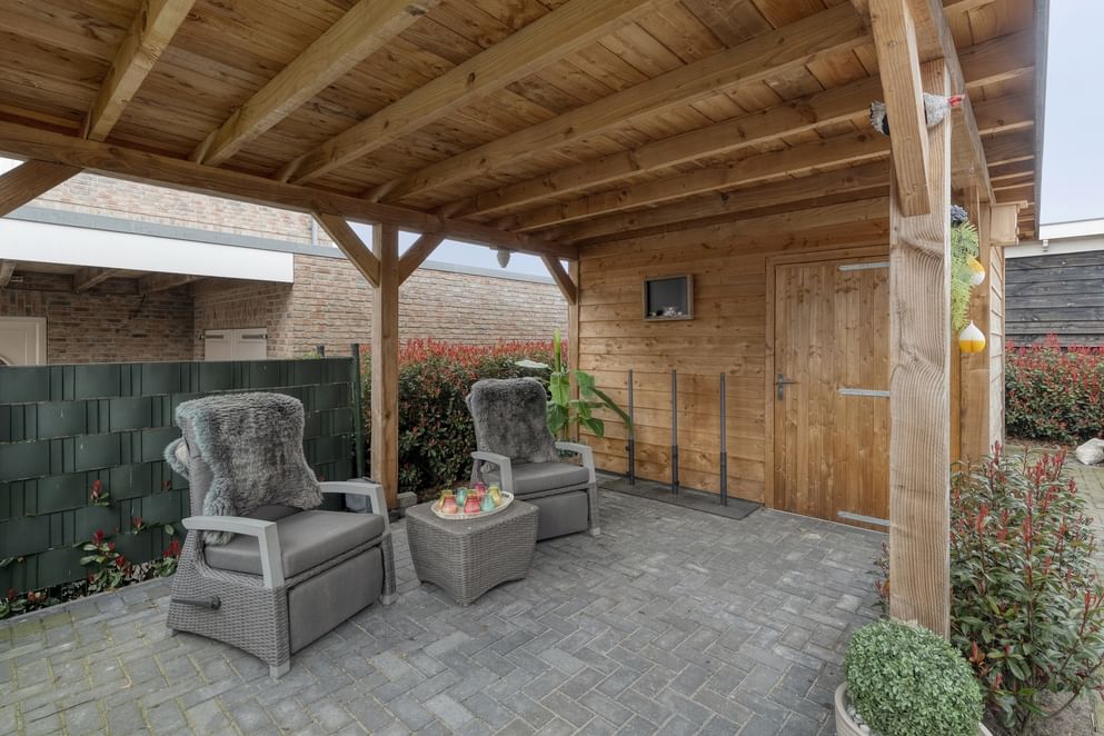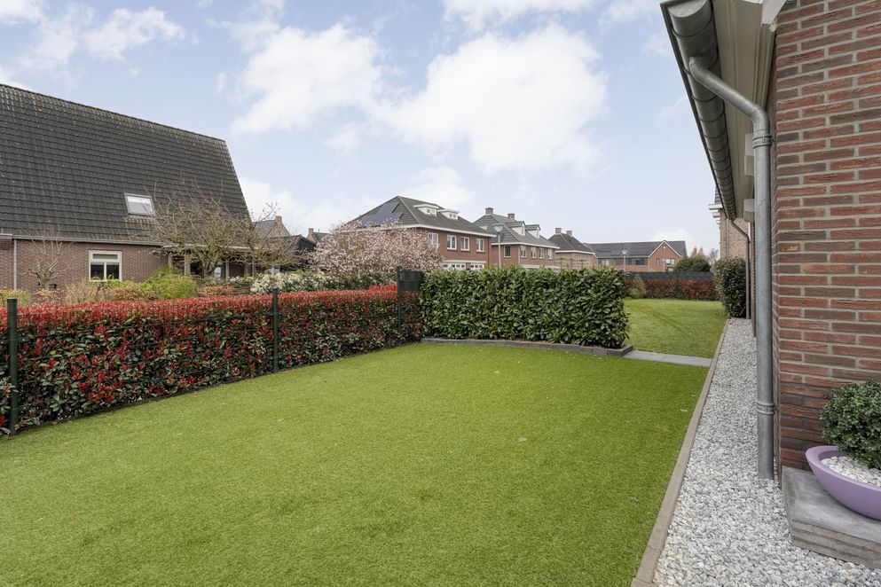 Via openslaande deuren in de keuken bereik je de verzorgde tuin. De tuin is rondom de woning gelegen, met een voor-, zij- en achtertuin, en is volledig afgesloten middels een degelijk hekwerk. De tuin is onderhoudsvriendelijk aangelegd en voorzien van fraai en hoogwaardig royalgrass kunstgras, waardoor je het hele jaar door geniet van een strak en verzorgd gazon zonder intensief onderhoud. Aan achterzijde bevindt zich een fraaie overkapping waar je zowel bij mooi als minder goed weer comfortabel kunt genieten van het buitenleven. Aansluitend vind je een berging welke ideaal is voor het opbergen van tuingereedschap en andere spullen.