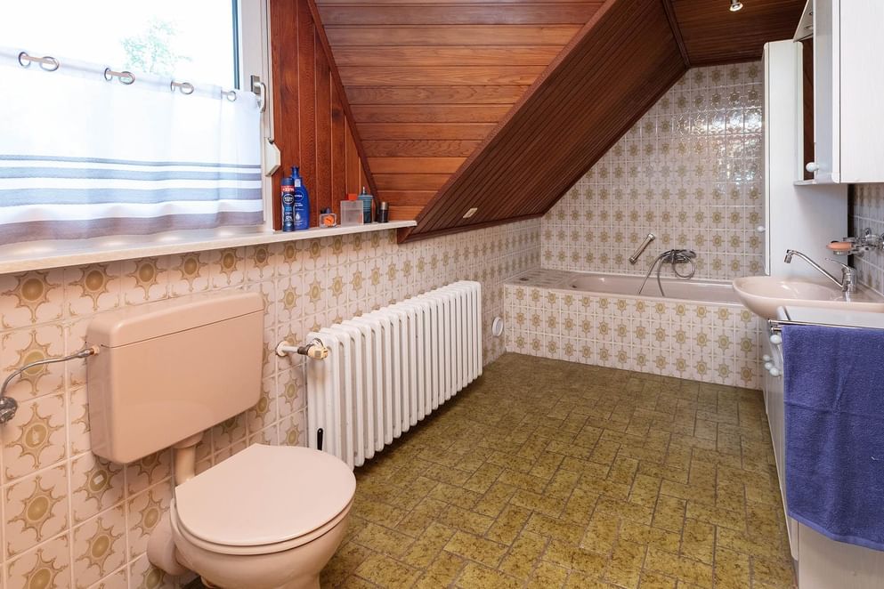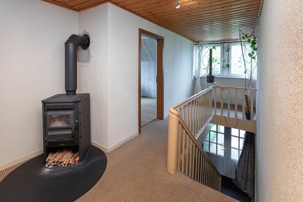 Via de vaste trap in de hal, komen wij aan op de eerste verdieping. Ook deze verdieping kan verwarmd worden met een houtkachel. Er is namelijk een kachel op de centrale overloop geplaatst. Daarnaast zijn op deze verdieping drie ruime slaapkamers gelegen, waarvan één is voorzien van een loggia en een badkamer. Deze badkamer is uitgerust met een ligbad, douchehoek, wastafel en toilet.
