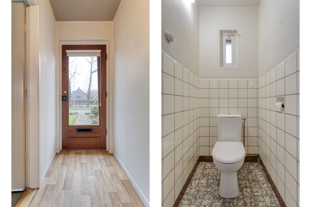 Vanuit de entree stap je binnen in de ruime hal met toilet en trapopgang. Aangrenzend is de ruime woonkamer te vinden. Dankzij de grote raampartijen en de open indeling biedt deze ruimte veel mogelijkheden. Vanuit de woonkamer is de keuken te bereiken.