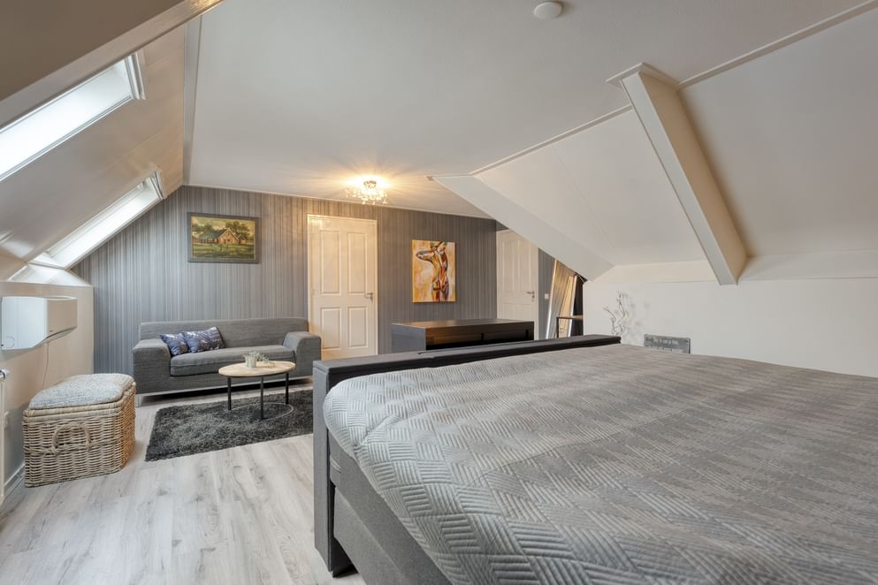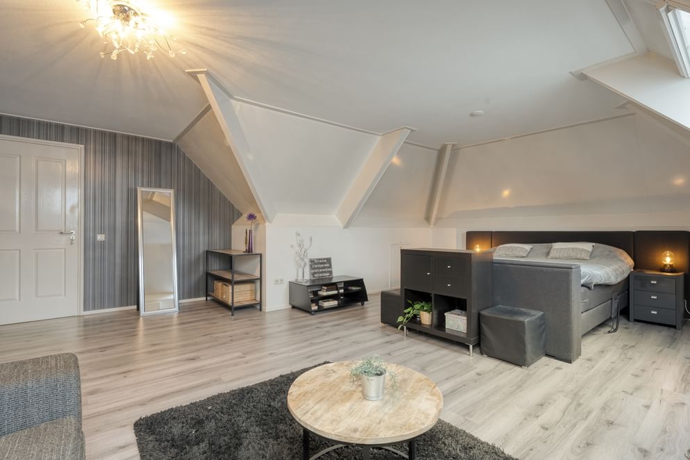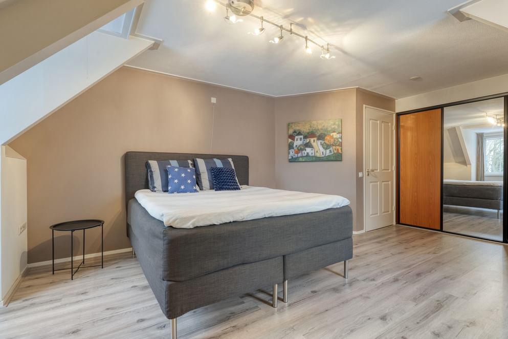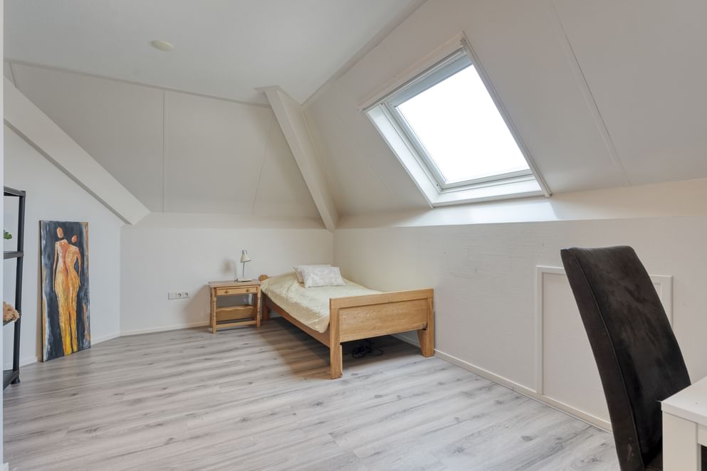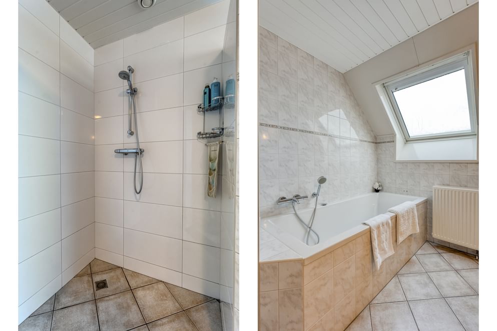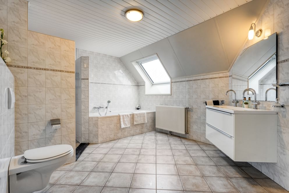 Vanaf de overloop zijn drie slaapkamers en de badkamer te bereiken. De masterbedroom is zeer riant in zijn afmeting. Vanuit deze slaapkamer is er toegang tot een bergkamer met de opstelplaats van de cv-ketel. Vanuit de bergkamer is er een vaste trap naar het portaal en een vlizotrap die toegang biedt tot de zolder. De andere slaapkamers zijn eveneens ruim opgezet en uitgerust met dakraam of dakkapel. De badkamer beschikt over een net afwerkingsniveau en is uitgerust met een badmeubel met twee spoelkranen, toilet, ligbad en inloopdouche.