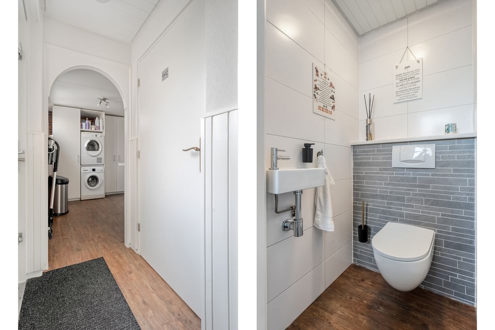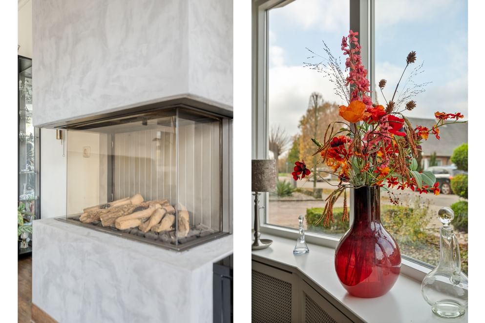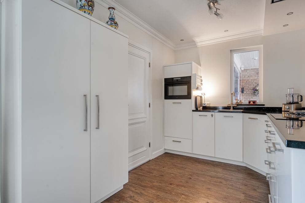 Via de entree stap je binnen in een hal met de trapopgang, de meterkast en directe toegang tot de eetkamer. Deze ruimte is stijlvol ingericht en biedt via dubbele openslaande deuren toegang tot de tuinkamer. De eetkamer loopt over in de keuken, die is uitgerust met diverse inbouwapparatuur, waaronder een inductiekookplaat, combi-oven, vaatwasser en koelkast. Aan de voorzijde van de woning bevindt zich de woonkamer, bereikbaar vanuit de eetkamer via een grote glazen schuifpui. De royale erker en de karakteristieke gashaard geven deze ruimte een sfeervolle uitstraling. De begane grond is voorzien van comfortabele vloerverwarming. Vanuit de keuken loop je door naar het tussenportaal. Hier vind je een deur naar de tuinkamer en een toilet. Vanuit het portaal bereik je tevens de bijkeuken, voorzien van een wastafel, witgoedaansluitingen en vaste kasten. Vanuit de bijkeuken zijn zowel de ruime garage als de achtergelegen berging bereikbaar. Bovendien biedt een luik hier toegang tot de kelderruimte.
