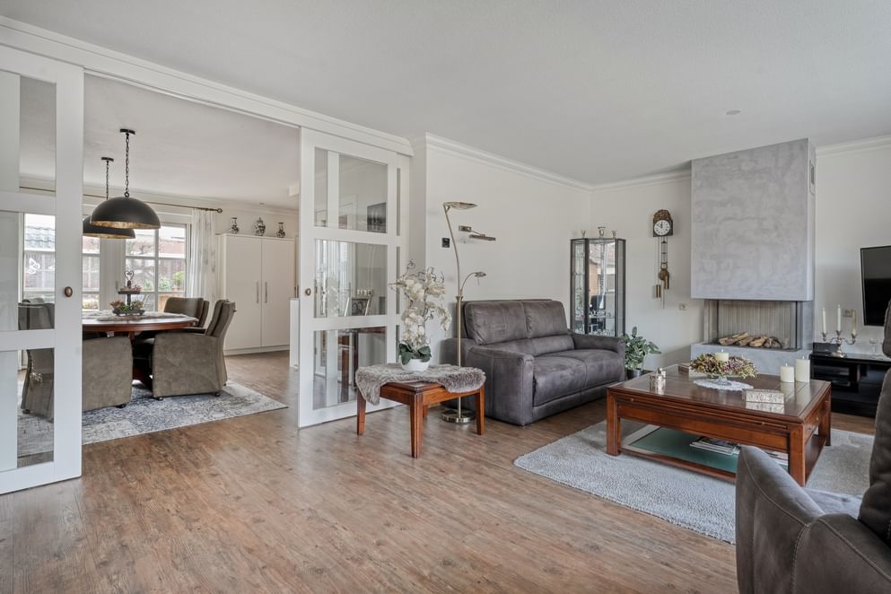 De Hartmanstraat 15 in Langeveen biedt verrassend veel leefruimte en ligt op een fijne, rustige locatie. De woning is goed onderhouden en de afgelopen jaren op meerdere punten gemoderniseerd, waaronder vloerisolatie, grotendeels dubbel glas en zonnepanelen. De ruime leefruimte bestaat uit een woonkamer en eetkamer die van elkaar gescheiden worden door sfeervolle kamer-en-suite deuren. De woonkamer is daarbij voorzien van een gezellige gashaard en een erker, wat zorgt voor extra sfeer en daglicht.