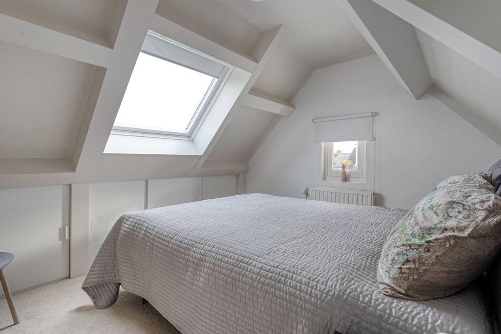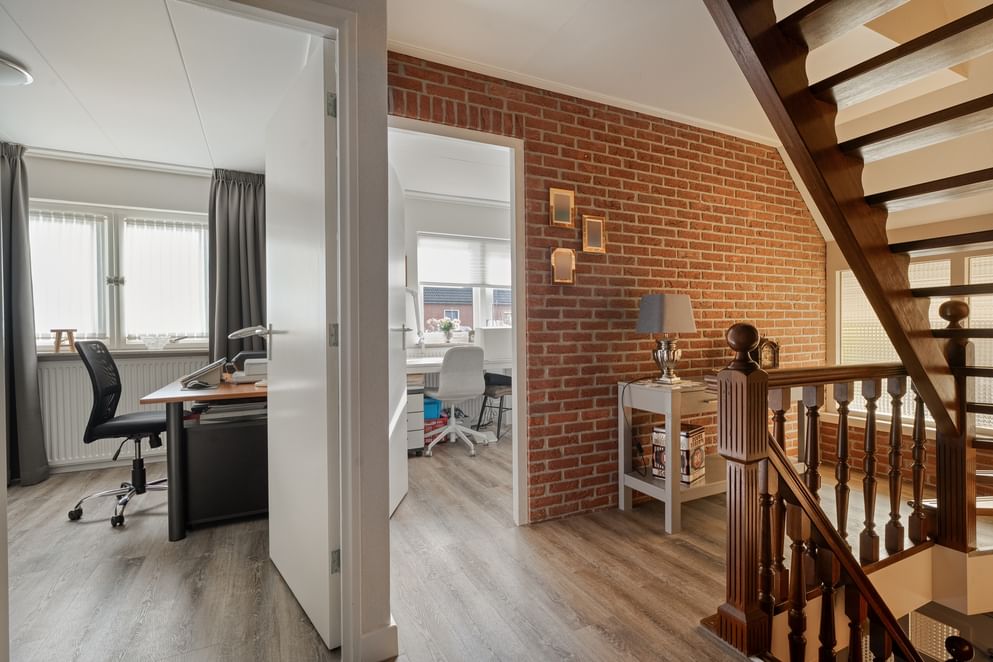 Via een vaste trap bereik je de tweede verdieping. De overloop biedt toegang tot twee ruime slaapkamers, waarvan één of beide kamers zich uitstekend lenen als hobby- of werkruimte.