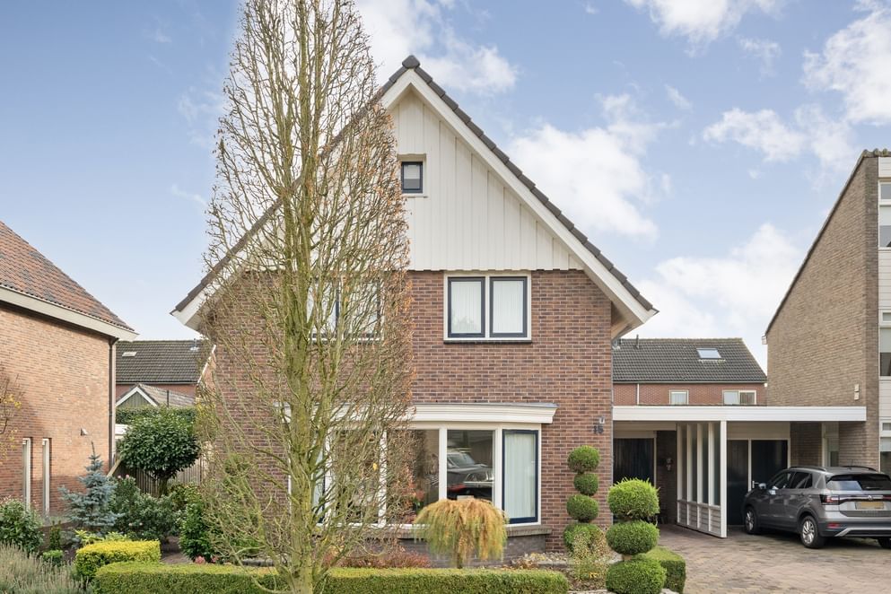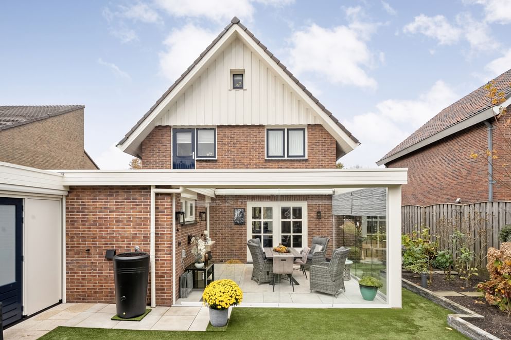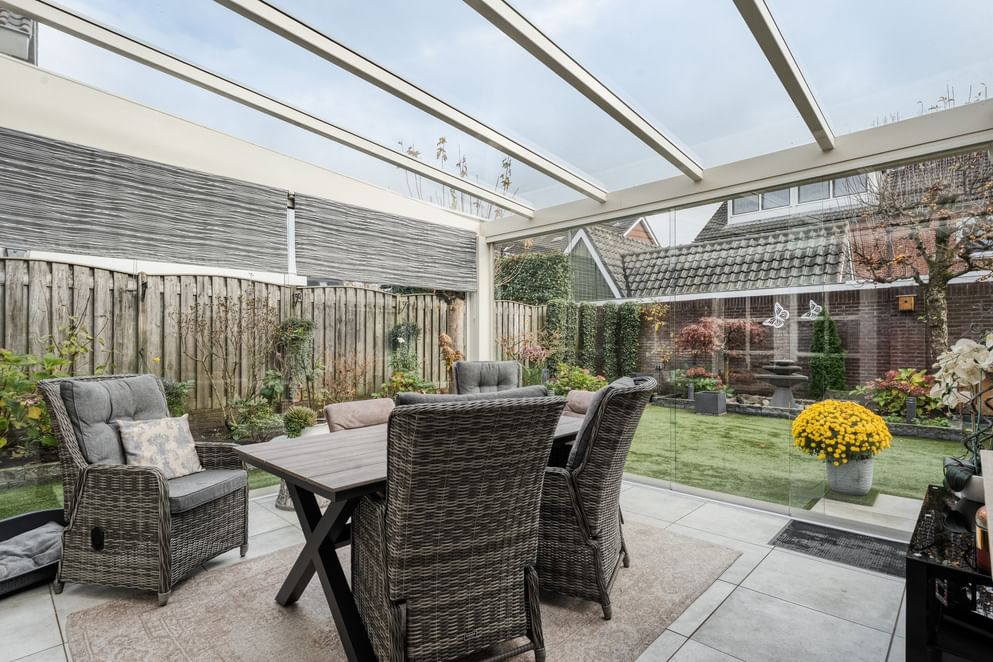 De tuin ligt op het zuidoosten en is, dankzij de ruime serre met elektrische screens aan het plafond, een heerlijke plek om te ontspannen. Door de glazen schuifdeuren kun je hier het hele jaar door genieten van het buitengevoel. De tuin is strak aangelegd, voorzien van kunstgras en beschikt bovendien over een praktische, kleine extra overkapping met een elektrische screen. Aan de zijkant van de woning vind je een oprit met carport. Deze oprit en carport bieden voldoende ruimte voor twee auto’s.