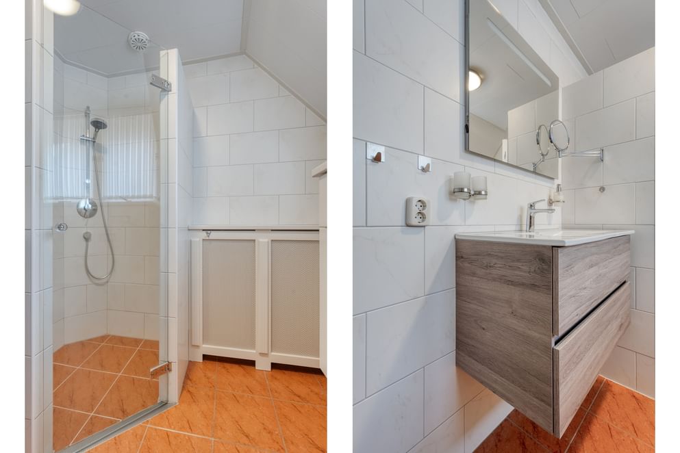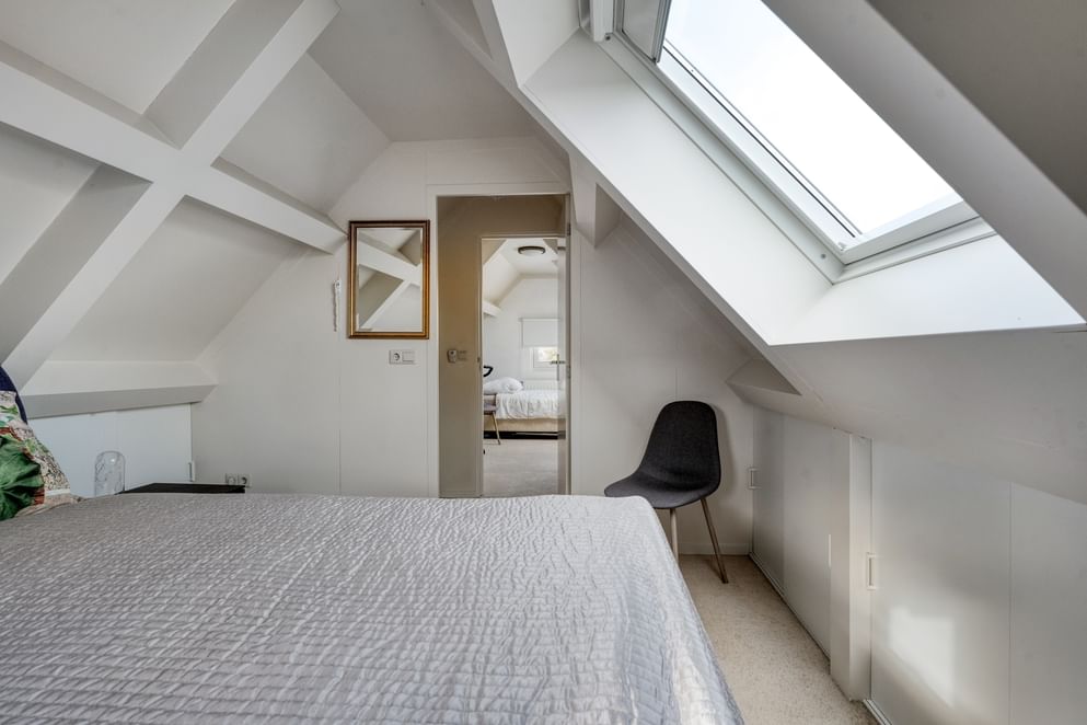 Vanaf de overloop is de badkamer en drie slaapkamers te bereiken, waarvan de hoofdslaapkamer uitgerust is met een ruime inloopkast. De badkamer is uitgerust met een dakkapel, toilet, wastafel, wastafelmeubel en inloopdouche.