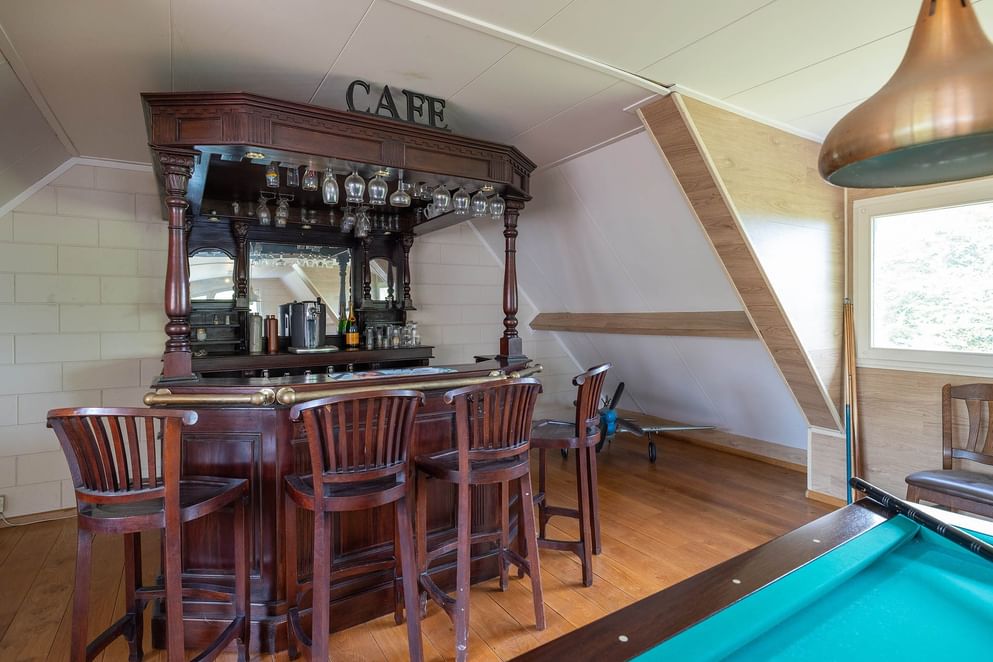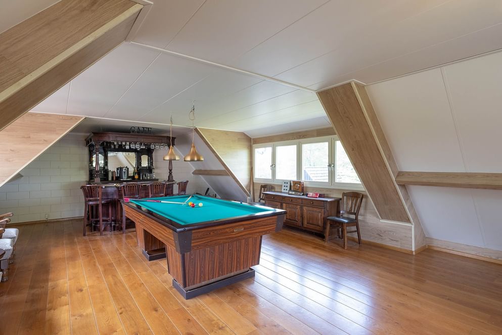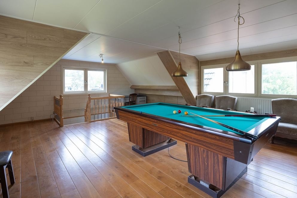 De andere eerste verdieping is te bereiken via de trap in de tweede berging. Deze verdieping bestaat uit één grote ruimte die momenteel is ingericht als een sfeervolle mancave. De royale oppervlakte leent zich uitstekend voor het creëren van extra (slaap)kamers en geniet bovendien volop daglicht dankzij twee grote dakkapellen