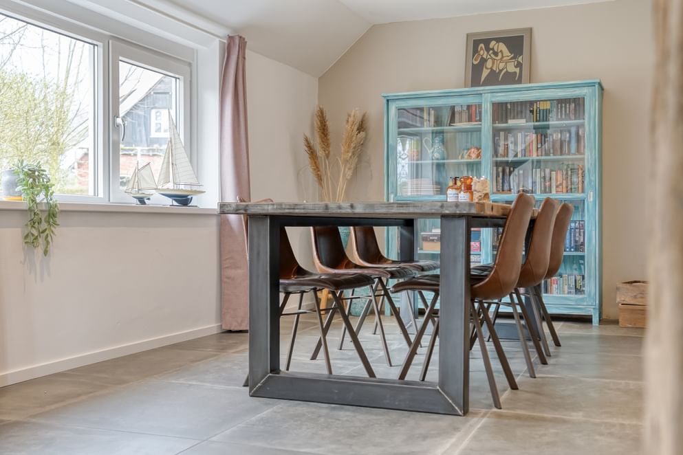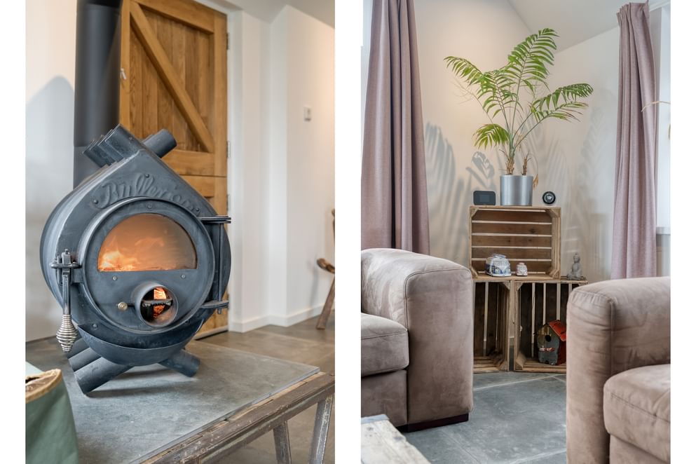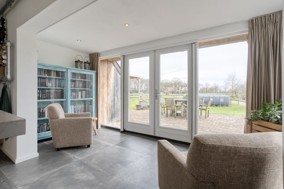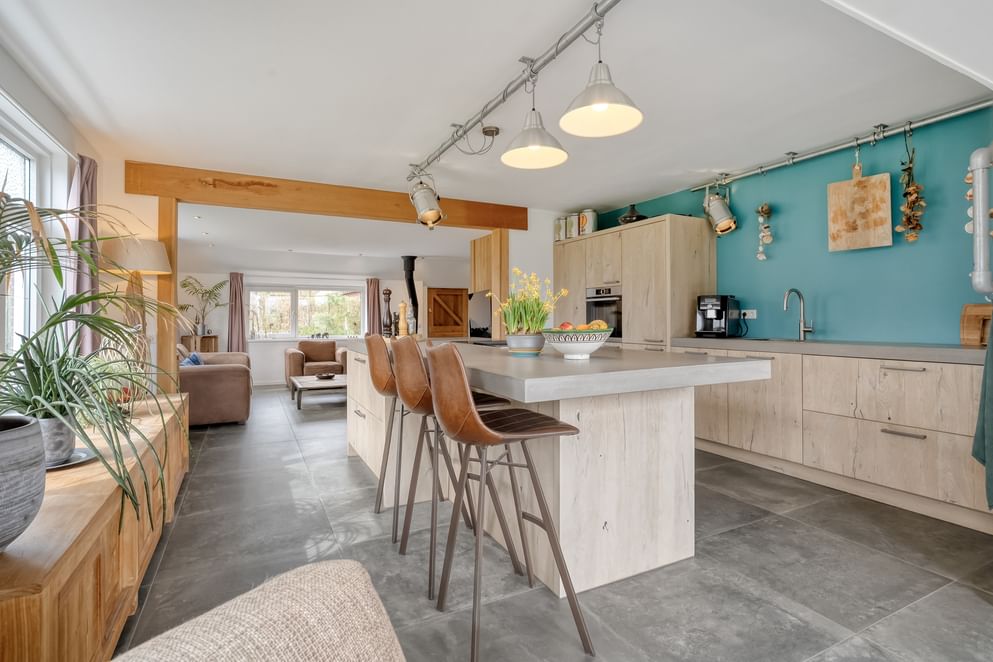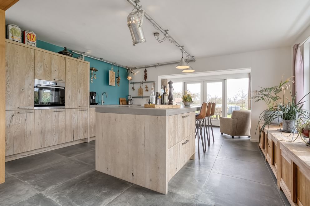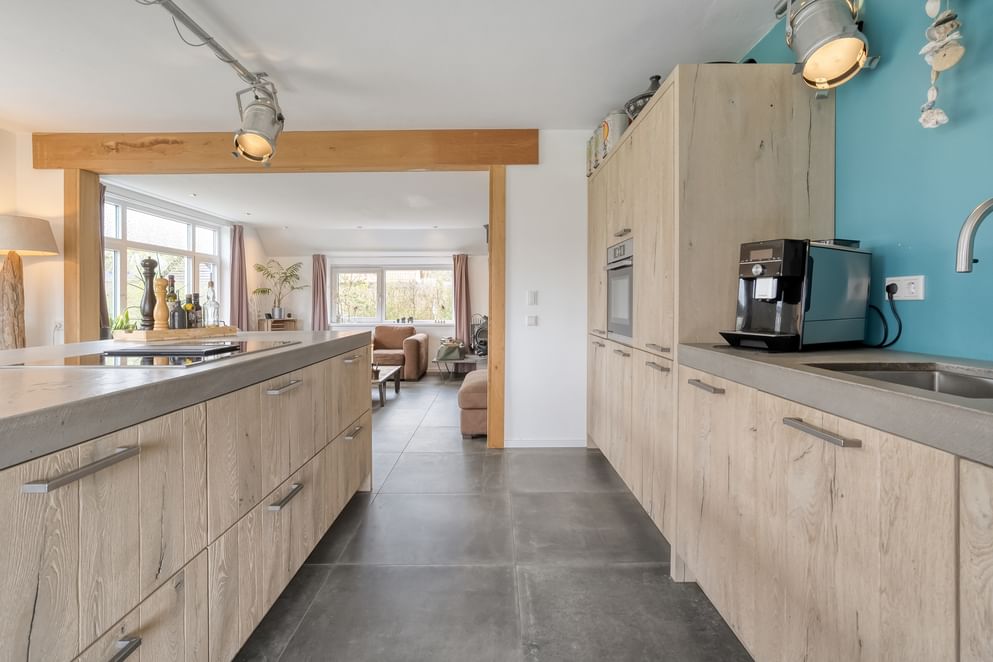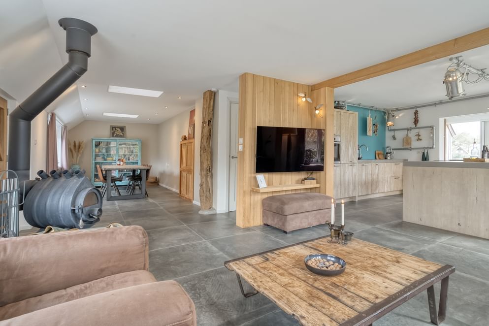 Het leefgedeelte is ruim opgezet en ingedeeld met een eetkamer en woonkamer, die naadloos overgaan in de open keuken. In de woonkamer zorgt een houtkachel voor extra sfeer en warmte. De keuken is voorzien van een kookeiland en diverse inbouwapparatuur, waaronder twee koelkasten en vriezers, combi-oven, 4-zone inductiekookplaat met afzuiging, vaatwasser en een Quooker. Aan de achterzijde van de keuken bevinden zich openslaande tuindeuren naar de zijkant van de woonboerderij, waardoor deze entree ook direct toegang geeft tot de woning.