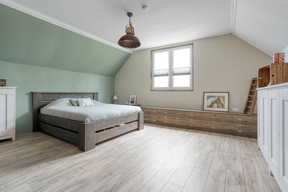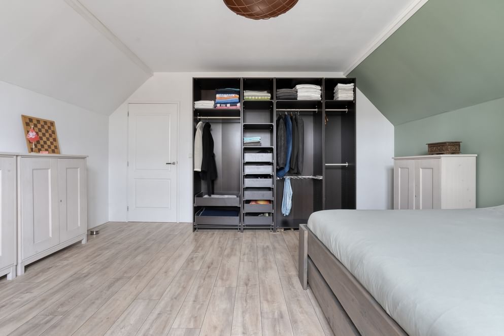De eerste verdieping is bereikbaar via een vaste trap die uitkomt op een ruime overloop met vide. Deze overloop biedt toegang tot de badkamer en drie slaapkamers en beschikt daarnaast over twee praktische vaste kasten. De slaapkamers zijn alle drie netjes afgewerkt. De badkamer, vernieuwd in 2021, heeft een excentrieke en eigentijdse uitstraling en is compleet uitgerust met een inloopdouche, toilet en een wastafel met bijpassend meubel.