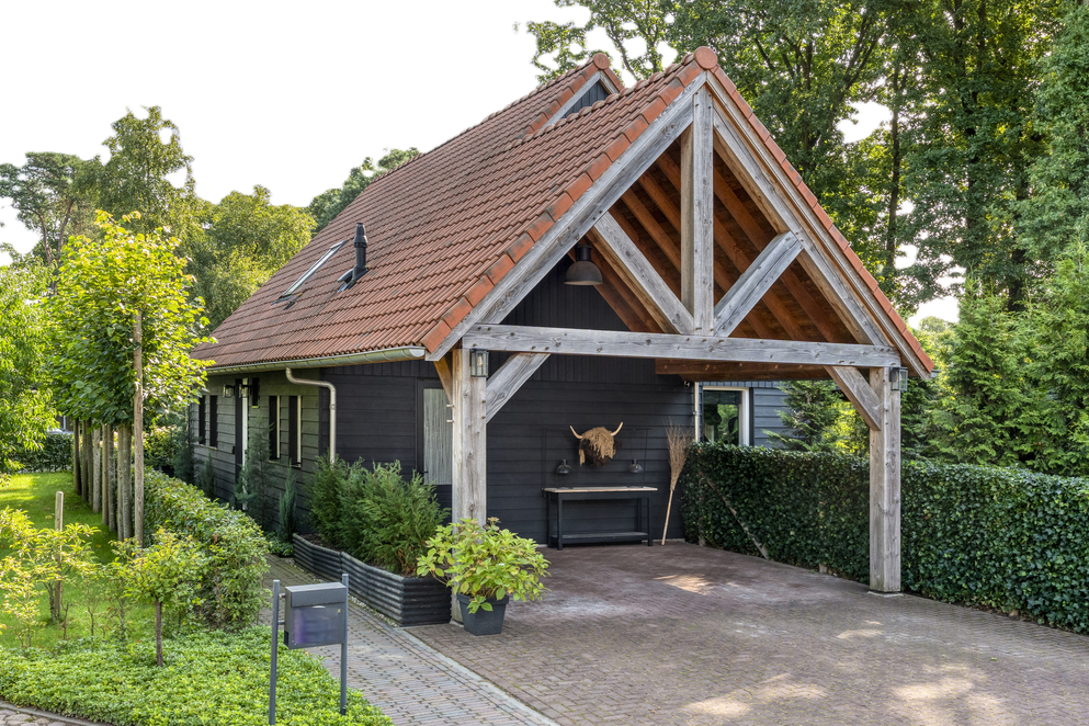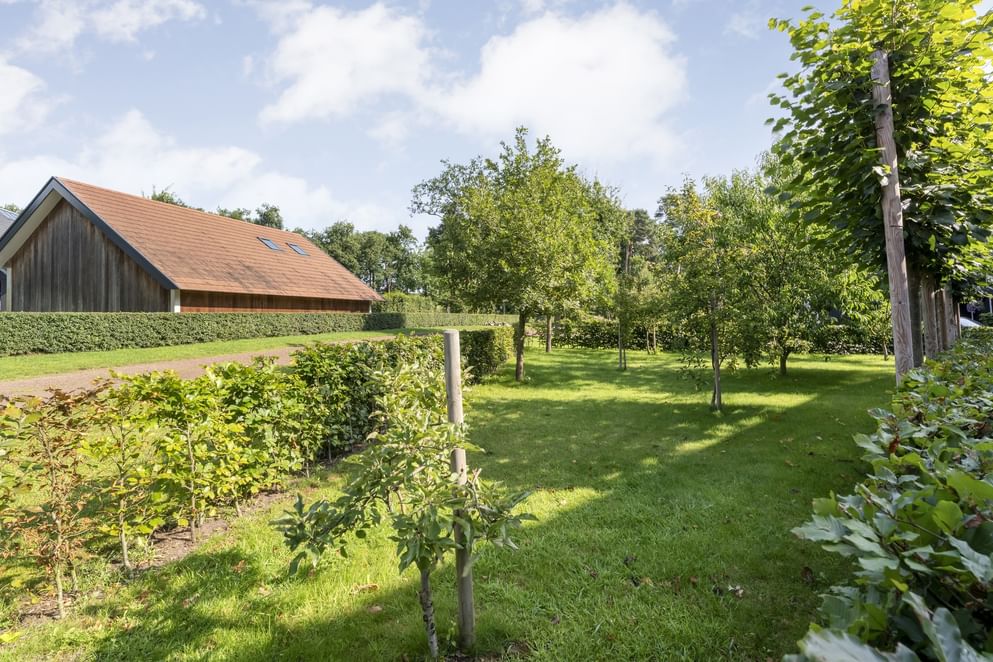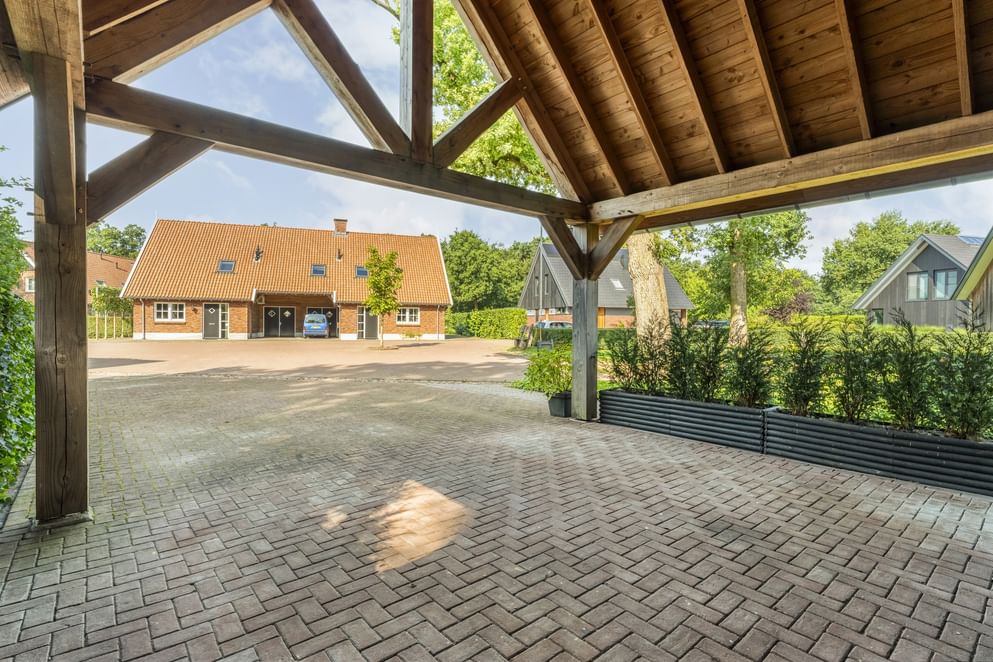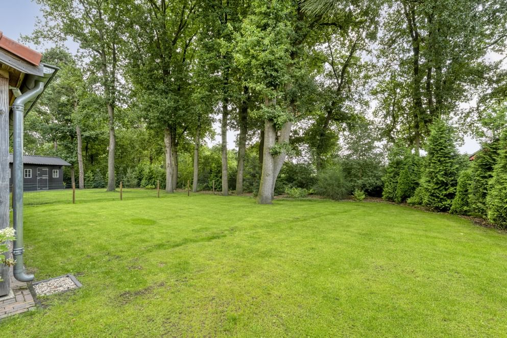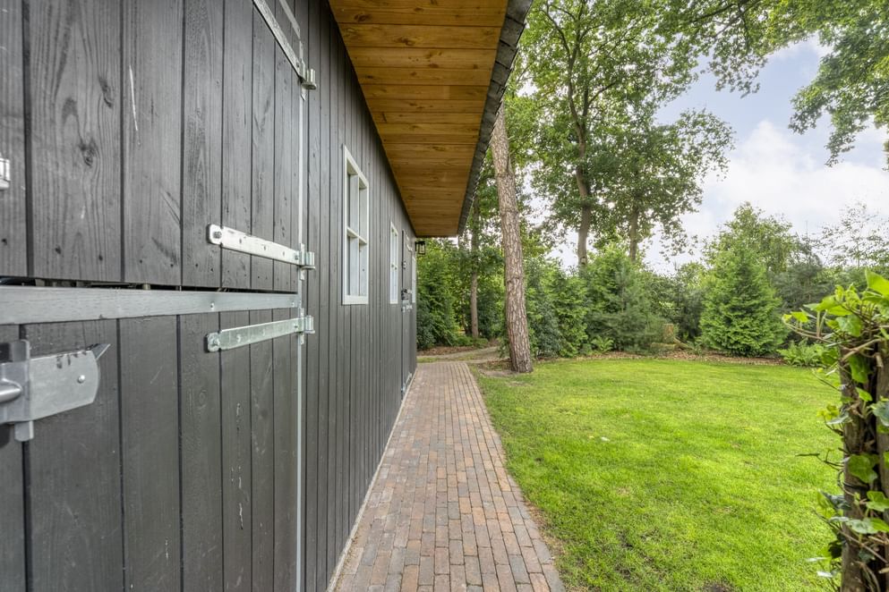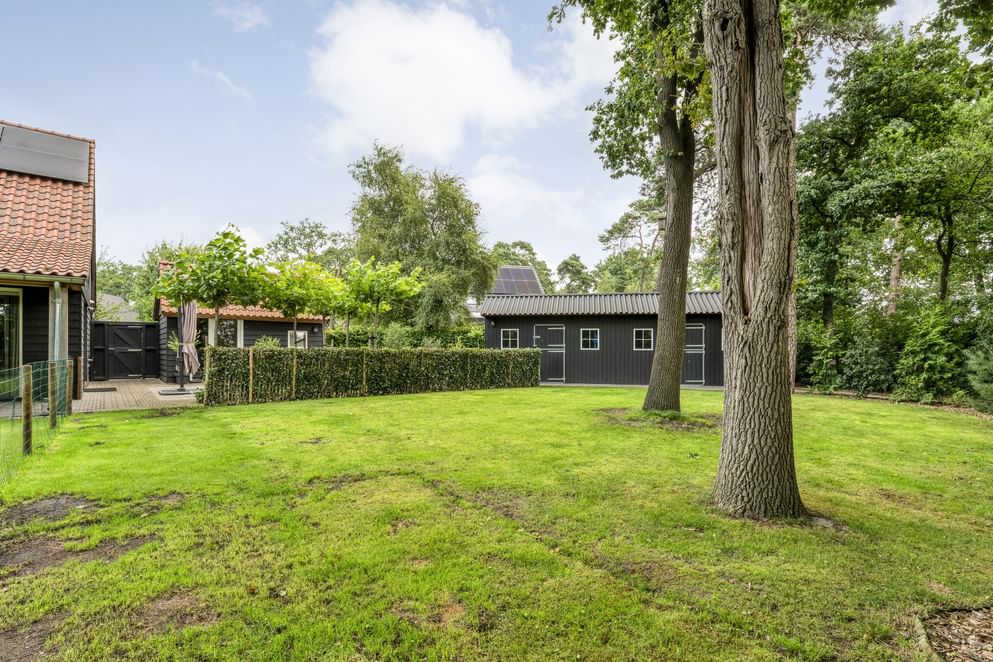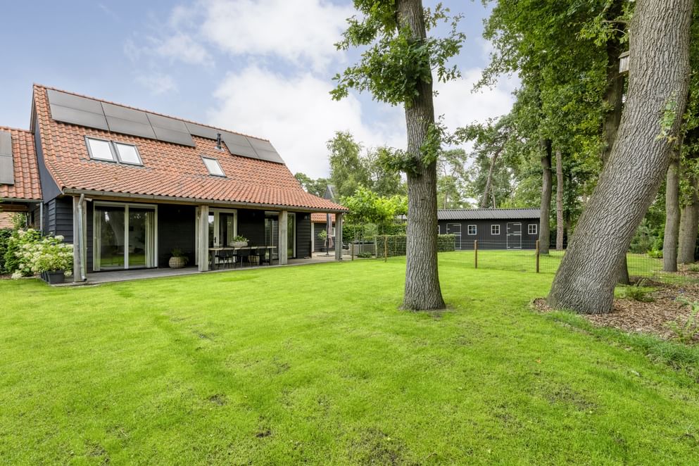De woning staat op een royaal perceel met volop ruimte rondom, wat zorgt voor volledige privacy. Het terrein is helemaal afgesloten en heeft een afsluitbare achterom. Aan de voorzijde ligt een oprit met veranda-carport en laadpaal. Aan de achterzijde grenst een overkapping aan de woning, een fijne plek om beschut te zitten met uitzicht op de verzorgde tuin. In de tuin staan grote eiken, berken en dennen, en er is zelfs een fruitboomgaard. Er zijn twee schuurtjes: één als berging en één met een werkplaats en twee stallen. Direct naast de stallen ligt een klein weitje, perfect voor kleinvee of een paar pony’s. Een buitenruimte die praktisch is ingericht én volop mogelijkheden biedt om van het buitenleven te genieten.