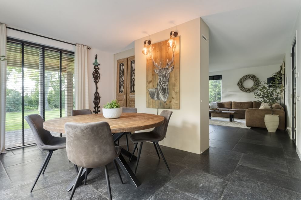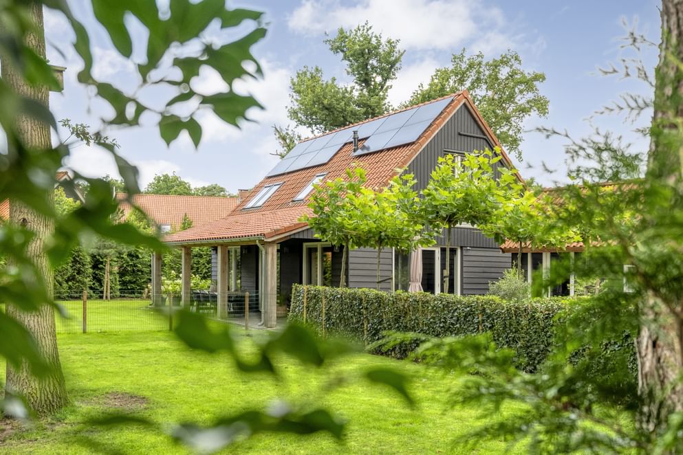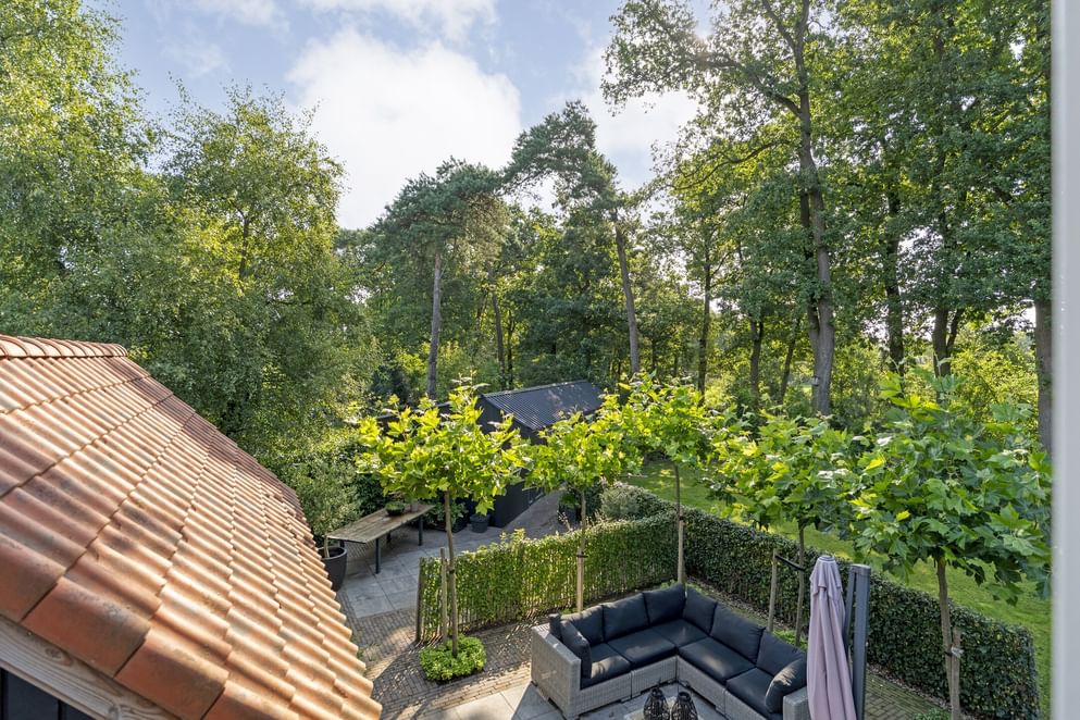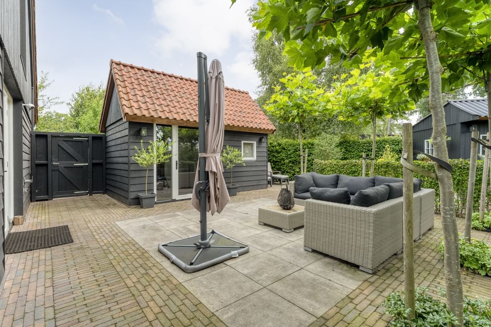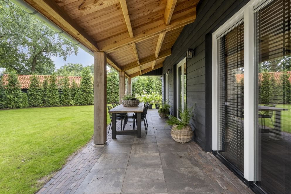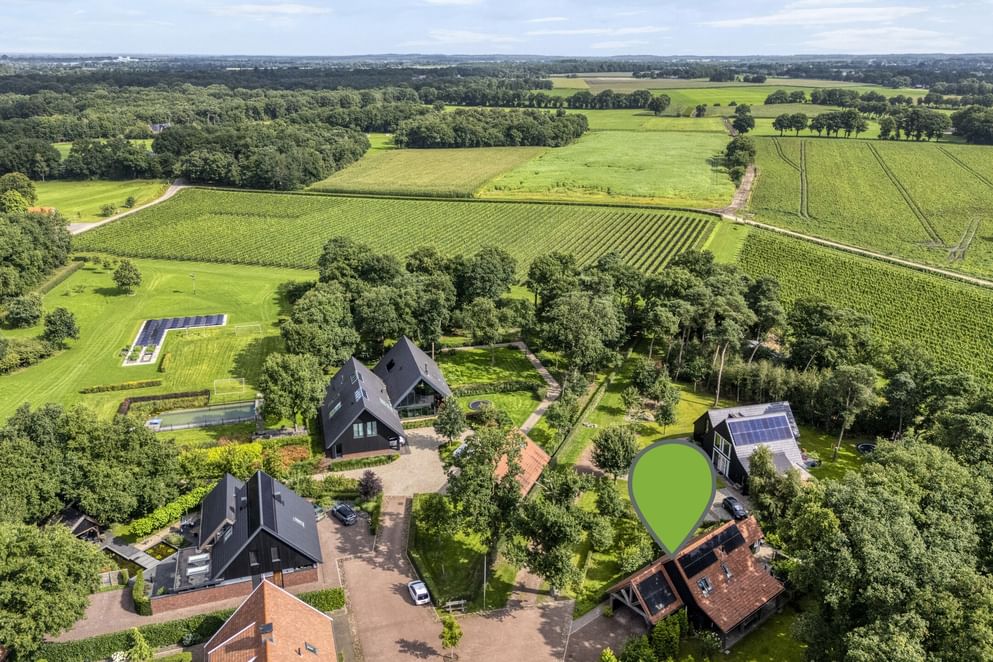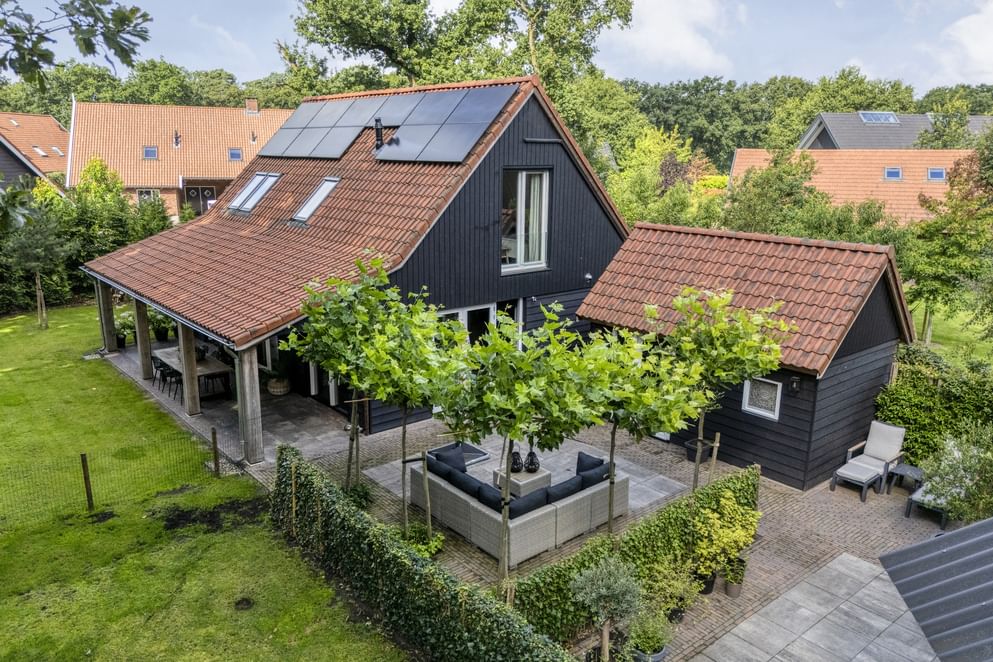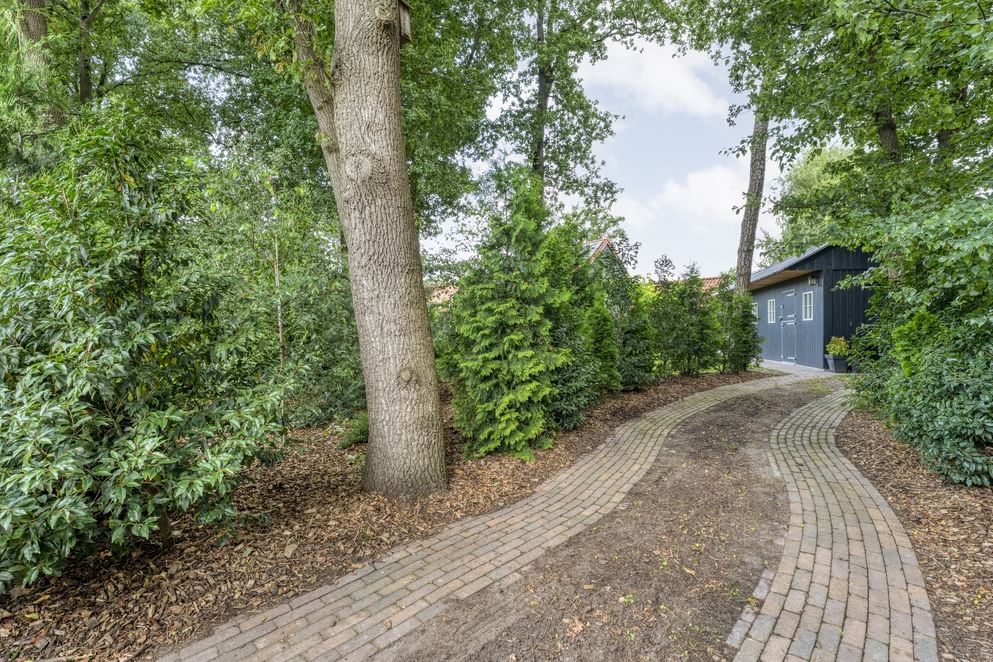 De woning staat op een royaal perceel met volop ruimte rondom, wat zorgt voor volledige privacy. Het terrein is helemaal afgesloten en heeft een afsluitbare achterom. Aan de voorzijde ligt een oprit met veranda-carport en laadpaal. Aan de achterzijde grenst een overkapping aan de woning, een fijne plek om beschut te zitten met uitzicht op de verzorgde tuin. In de tuin staan grote eiken, berken en dennen, en er is zelfs een fruitboomgaard. Er zijn twee schuurtjes: één als berging en één met een werkplaats en twee stallen. Direct naast de stallen ligt een klein weitje, perfect voor kleinvee of een paar pony’s. Een buitenruimte die praktisch is ingericht én volop mogelijkheden biedt om van het buitenleven te genieten.