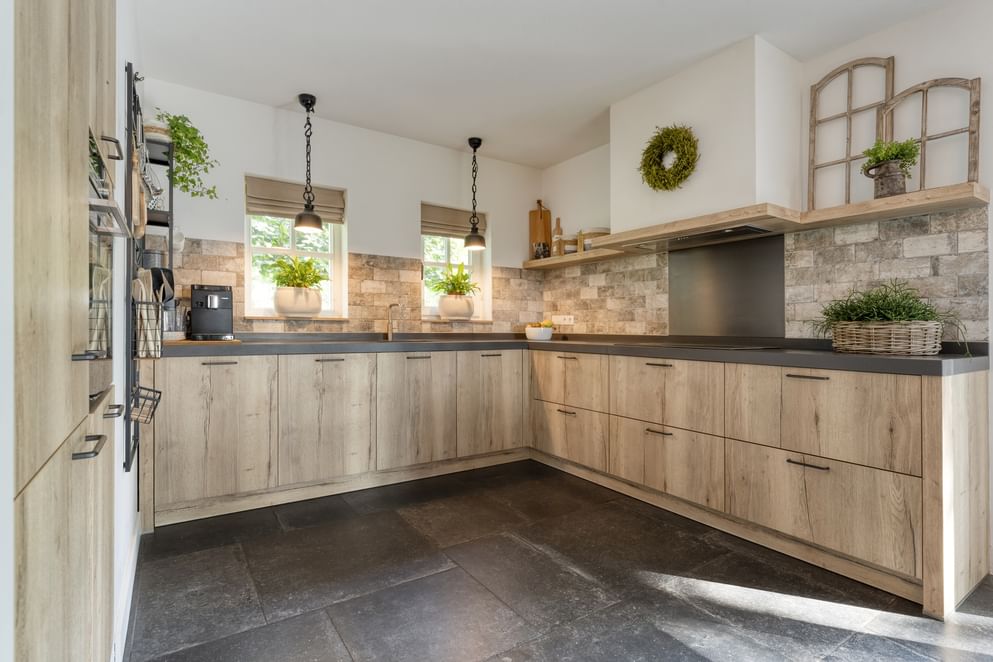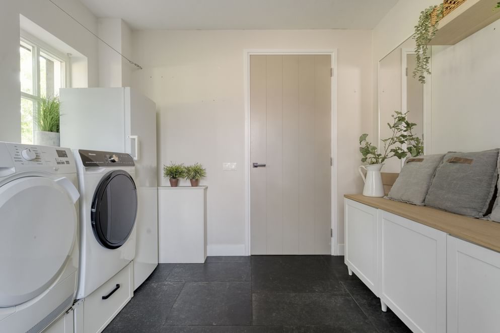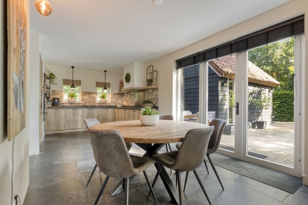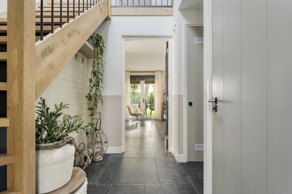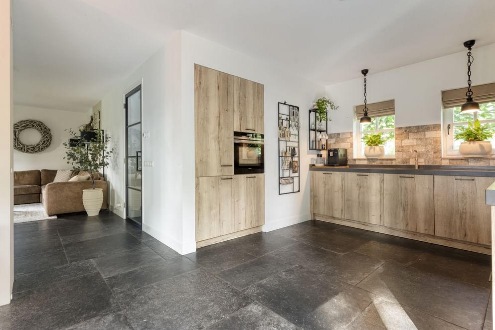 De woning wordt betreden via de zijkant, waar een hal toegang biedt tot de trap naar de eerste verdieping, het toilet met fontein, de meterkast, de bijkeuken en het leefgedeelte. In de bijkeuken is een aansluiting voor witgoed aanwezig en via een buitendeur is er toegang tot de oprit en de carport aan de voorzijde. Het leefgedeelte bestaat uit een lichte woonkamer met gashaard en openslaande tuindeuren naar de overkapping in de achtertuin. De woonkamer loopt door in de eetkamer en de open keuken. De keuken is uitgerust met diverse inbouwapparatuur, waaronder een koelkast, combi-oven, vaatwasser, quooker, inductiekookplaat met flexfunctie en een afzuigkap. Ook vanuit de eetkamer leiden openslaande tuindeuren direct naar de achtertuin, waardoor binnen en buiten mooi in elkaar overlopen.