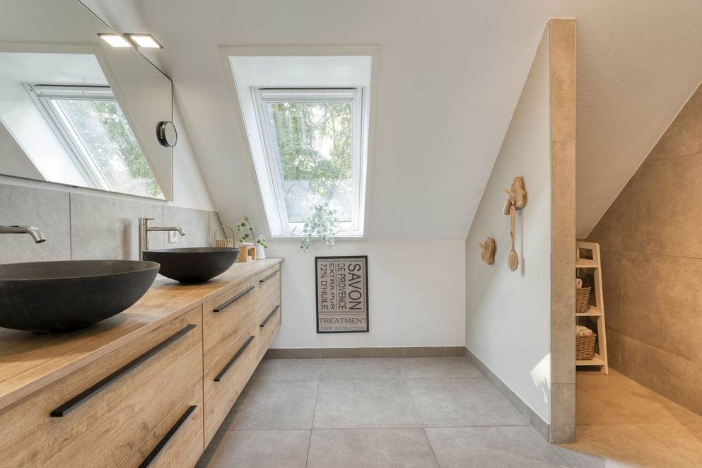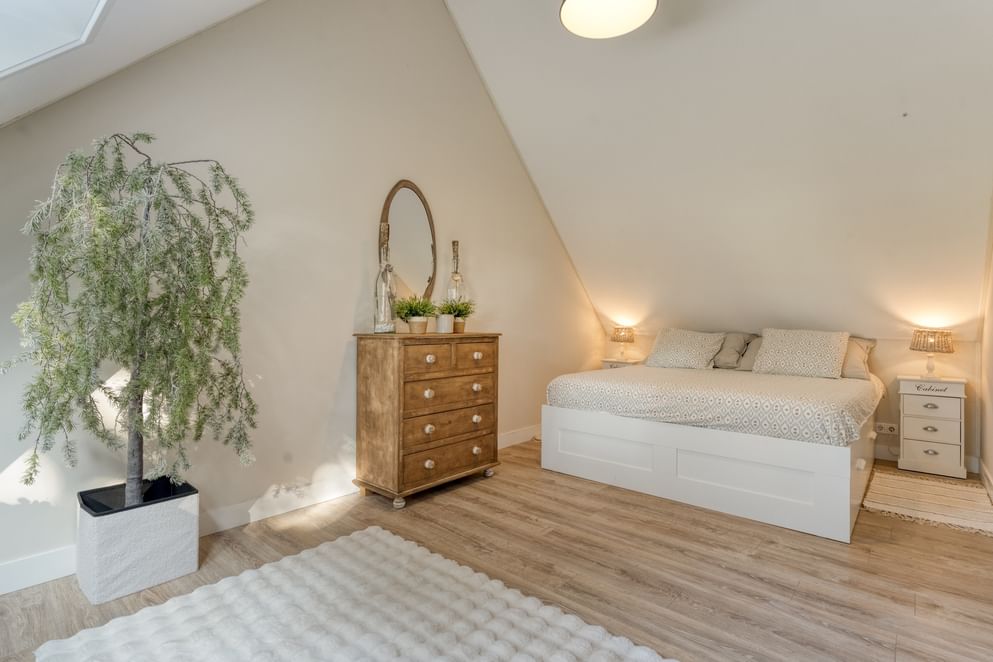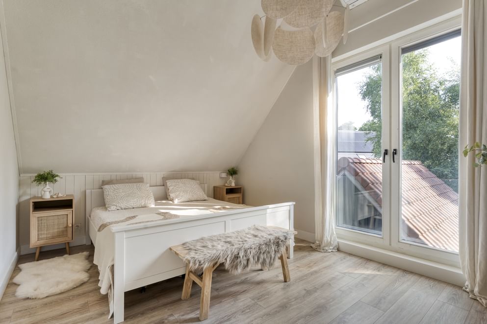 Vanaf de overloop is er toegang tot twee slaapkamers, de badkamer en een apart toilet. Beide slaapkamers zijn ruim van opzet. Eén kamer beschikt over airconditioning, een Frans balkon en vaste kasten, terwijl de andere is voorzien van twee dakramen. De badkamer is uitgerust met een dubbele wastafel met meubel, een inloopdouche en een dakraam voor natuurlijk licht en ventilatie.
