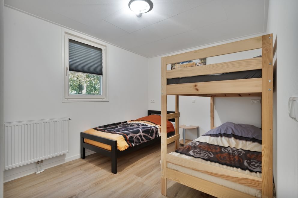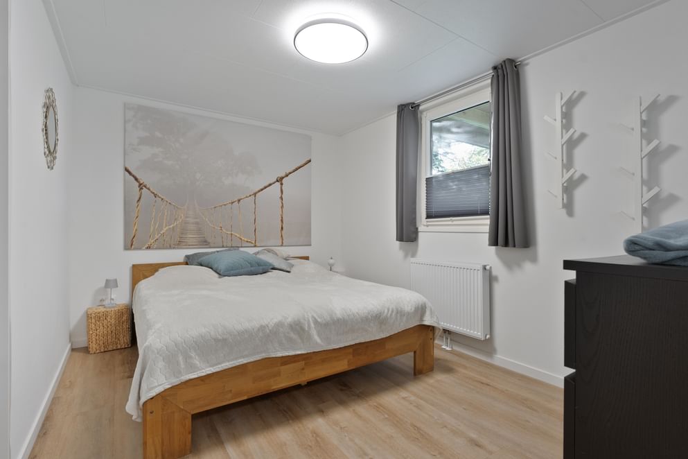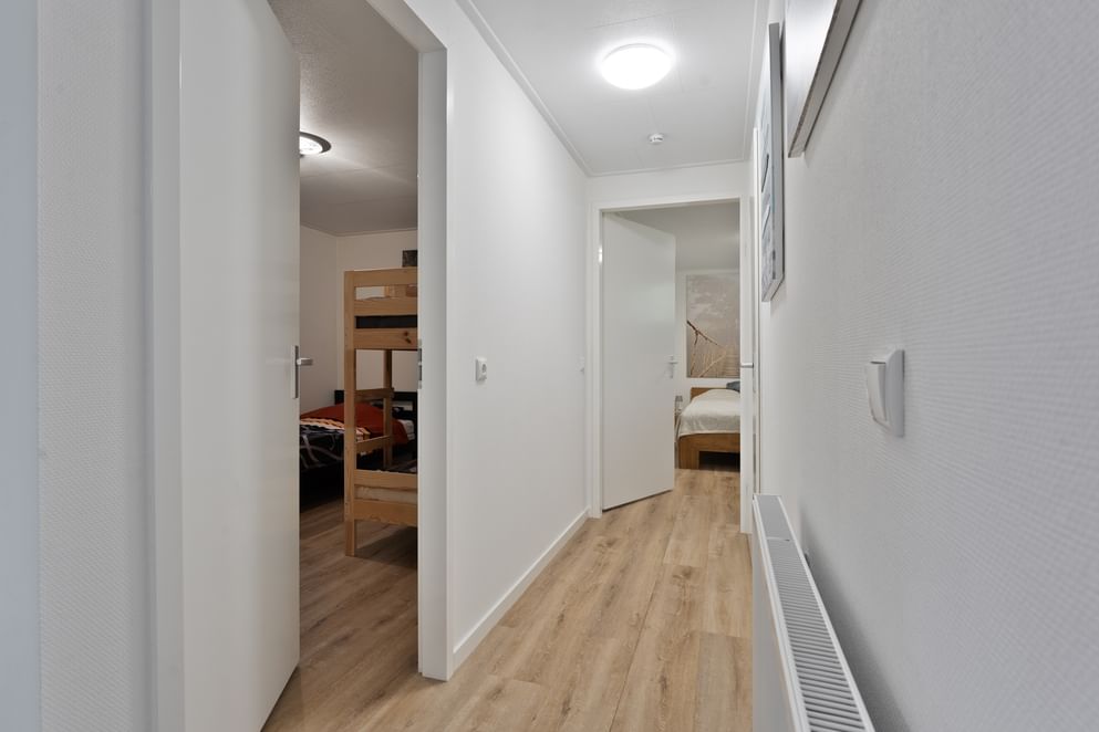 Via de entree stap je binnen in de hal met toegang tot een praktische berging met meterkast, CV-opstelling en witgoedaansluiting. Vanuit de hal loop je door naar de woonkamer welke licht en stijlvol is ingericht en voorzien van openslaande tuindeuren die toegang bieden tot de overkapping. Aangrenzend is de keuken met diverse inbouwapparatuur gesitueerd. Aan de rechterzijde van de recreatiewoning zijn twee slaapkamers en een separaat toilet te vinden. De masterbedroom biedt toegang tot de nette badkamer, uitgerust met een toilet, wastafel en douche.