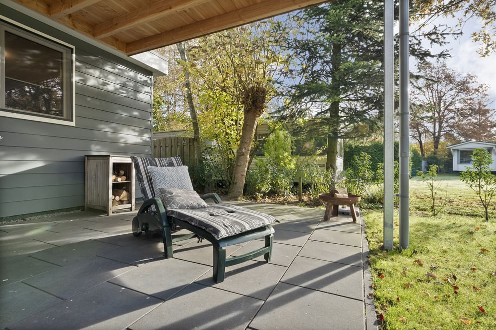 De tuin rondom is normaal aangelegd en biedt een fijne plek om te ontspannen. Onder de overkapping kun je heerlijk genieten van de groene omgeving en de rust. Aan de linkerzijde bevindt zich een kleine berging, handig voor het opbergen van tuinspullen.