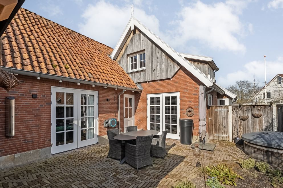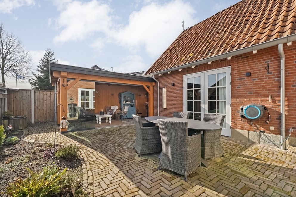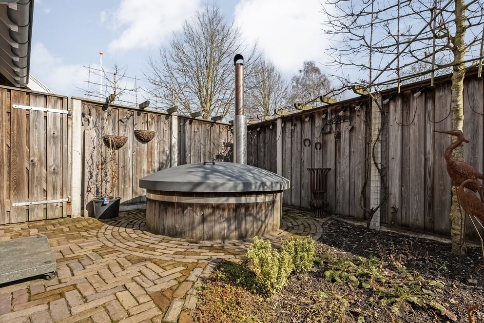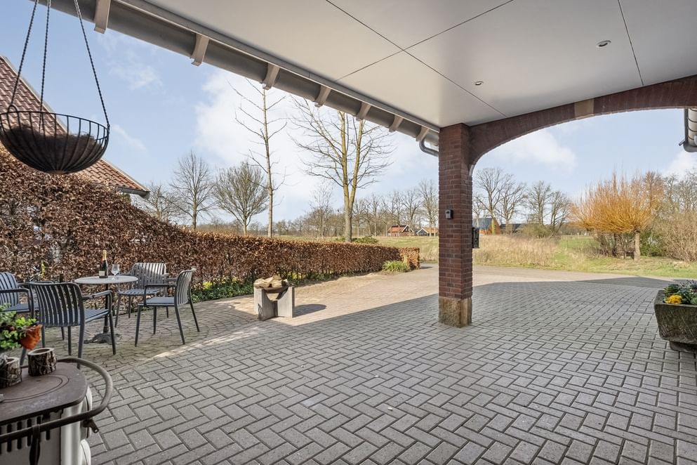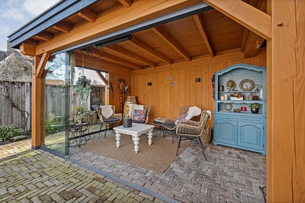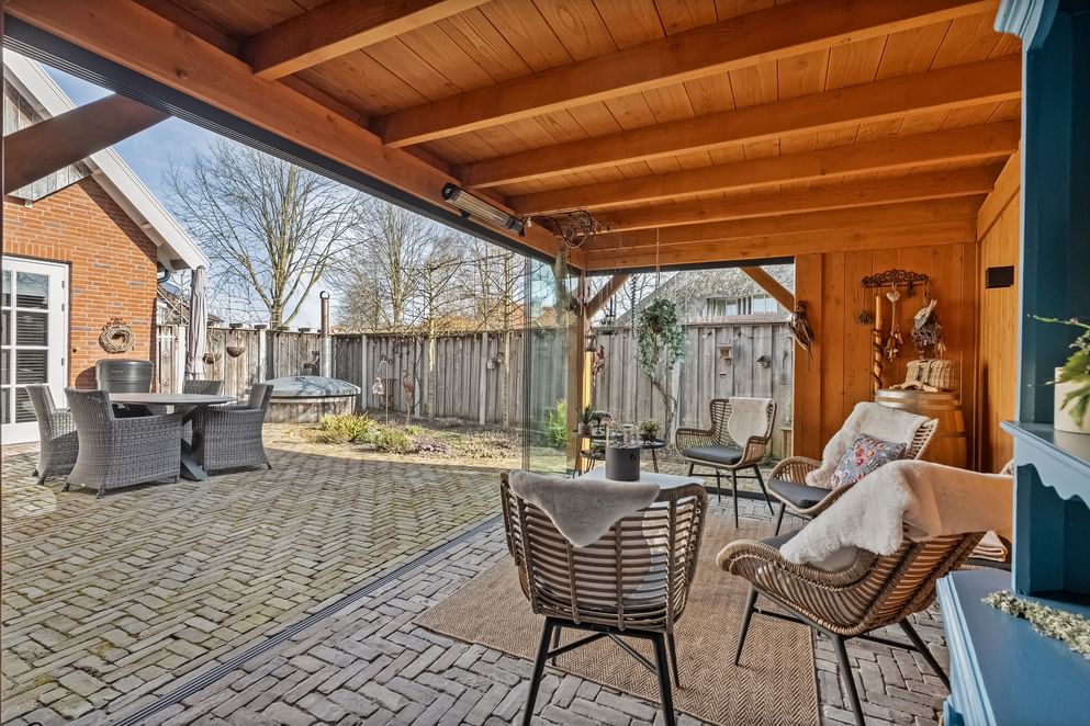 De onderhoudsvriendelijke tuin is grotendeels betegeld, waardoor je hier weinig omkijken naar hebt. Daarnaast is de tuin voorzien van een eigen grondwaterpomp, waarmee je eenvoudig en voordelig de tuin kunt beregenen. In de achtertuin vind je een recent gebouwde overkapping (2024), die volledig afsluitbaar is met glazen schuifdeuren aan de voor- en zijkant.
