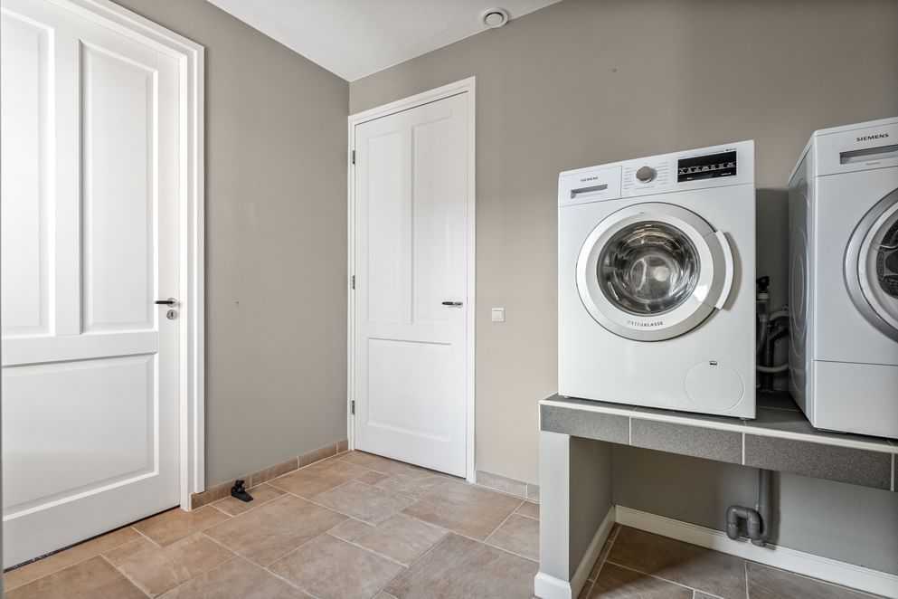 Aansluitend kom je in de bijkeuken, waar je de aansluitingen voor witgoed en een ruime voorraadkast vindt. Vanuit hier bereik je de slaapkamer op de begane grond. Deze kamer is voorzien van airconditioning en openslaande tuindeuren. Daarnaast heb je vanuit de slaapkamer toegang tot een inloopkast en de badkamer, die is ingericht met een dubbele wastafel, douche en toilet. Via de bijkeuken kom je ook in de garage. In de garage bevindt zich een deur naar een ruime kelder, ideaal voor extra opslag.