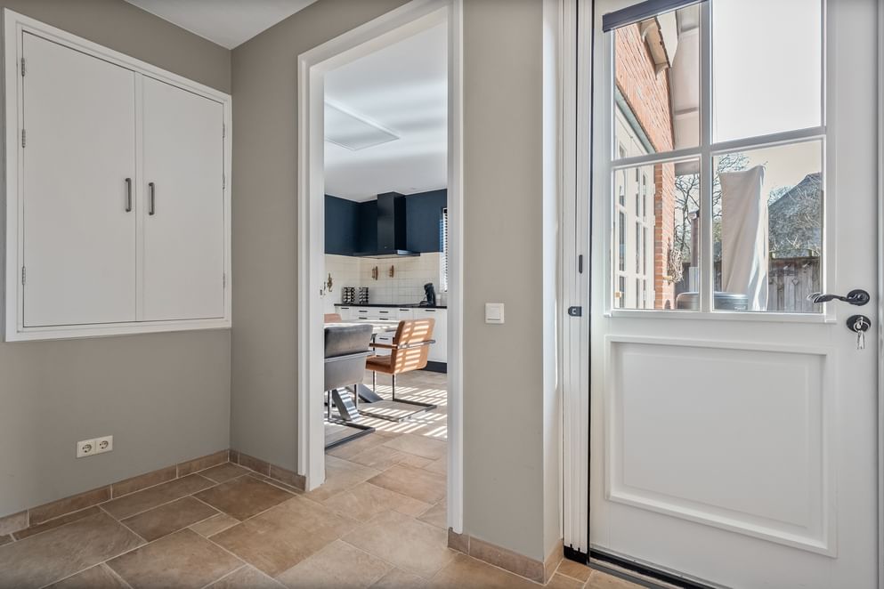Je betreedt de woning via de entree, waar je het toilet, de meterkast en de trap naar de eerste verdieping vindt. Vanuit de hal loop je door naar de woonkamer. De woonkamer is opgedeeld in een zit- en eetgedeelte en voelt direct sfeervol aan dankzij de gezellige houtkachel en de erker, die zorgt voor veel lichtinval. Tussen de woonkamer en de keuken bevinden zich dubbele schuifdeuren, waardoor je de ruimtes van elkaar kunt scheiden of juist open met elkaar kunt verbinden. De keuken is uitgerust met modern inbouwapparatuur, grotendeels vernieuwd in 2022, zoals een koffieapparaat, stoomoven, inductiekookplaat, afzuigkap, vaatwasser, Quooker en koelkast. Vanuit de keuken geven openslaande tuindeuren je direct toegang tot de tuin.